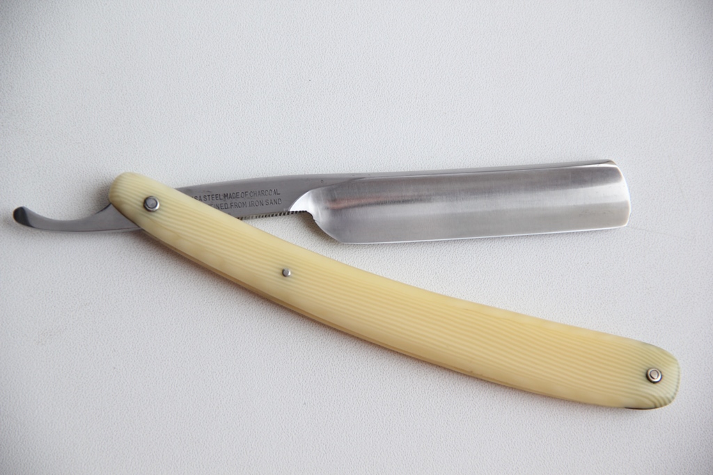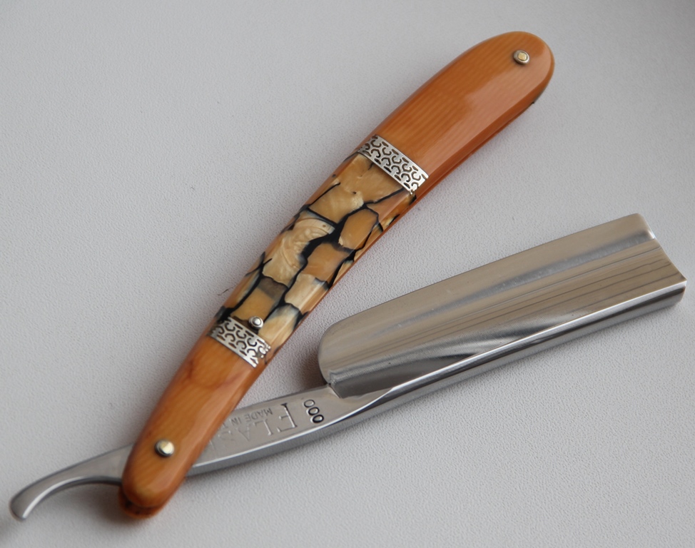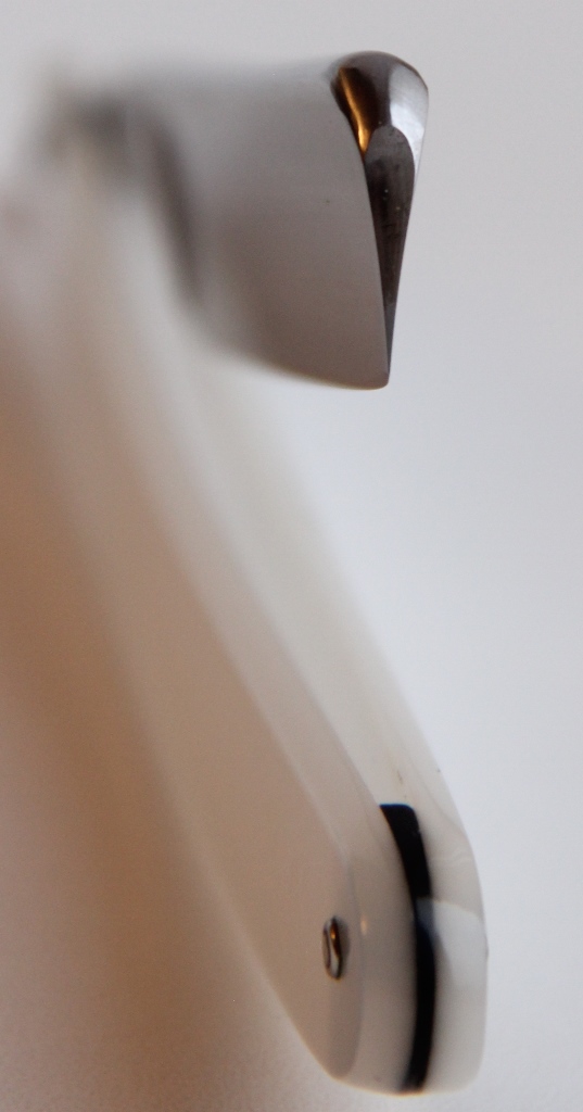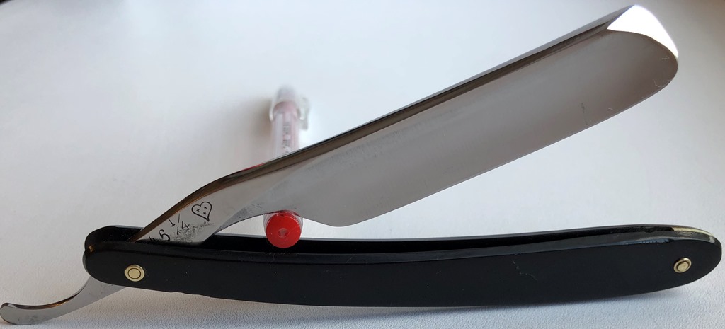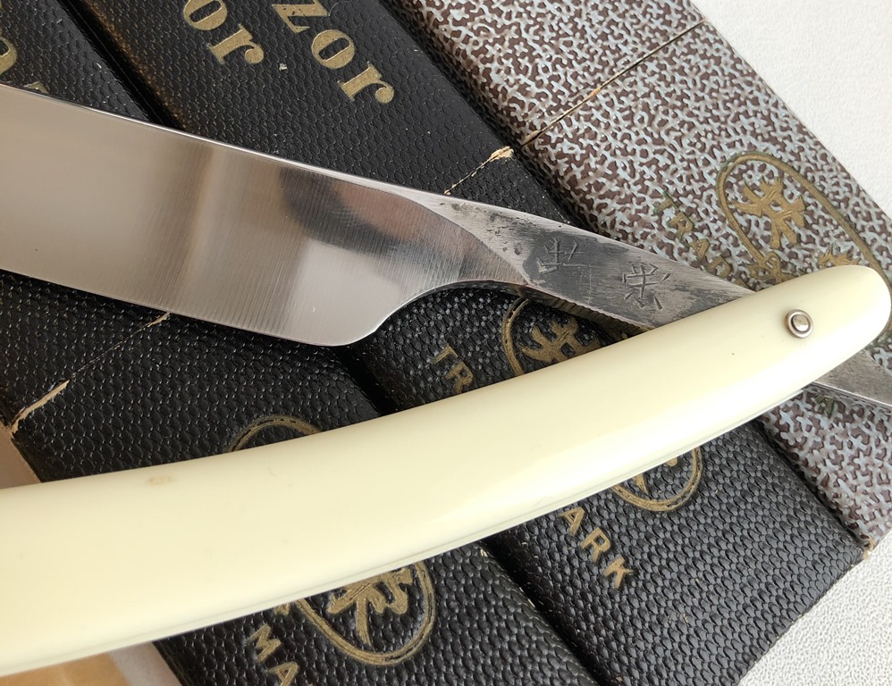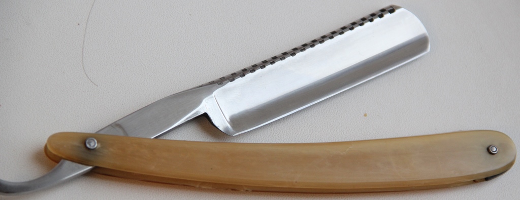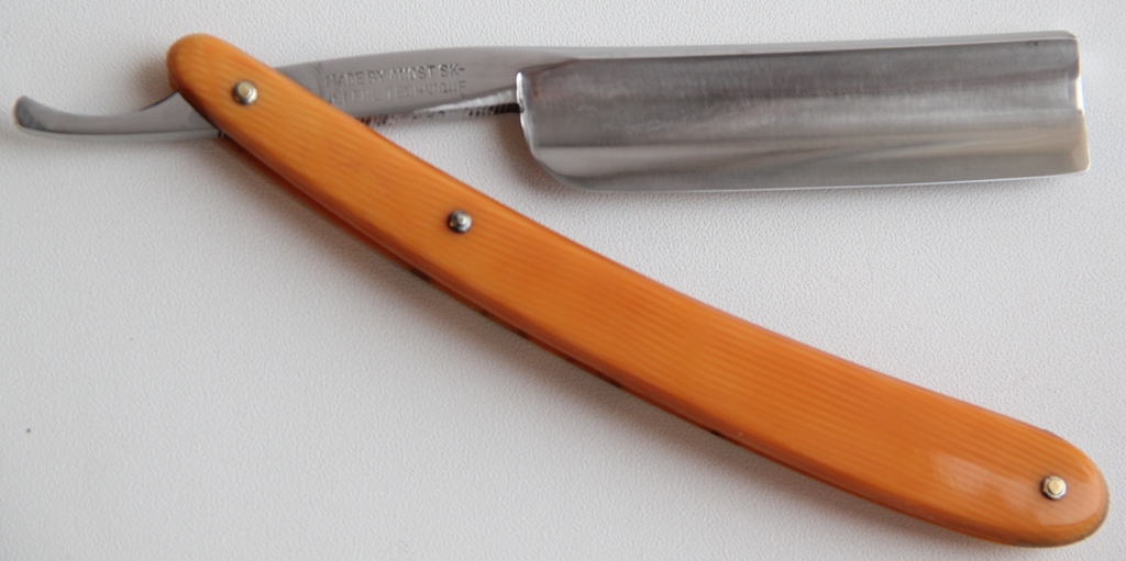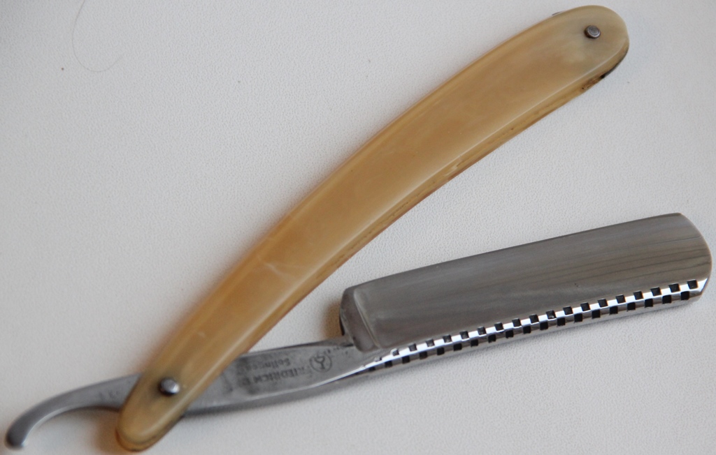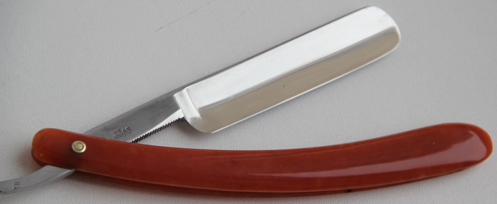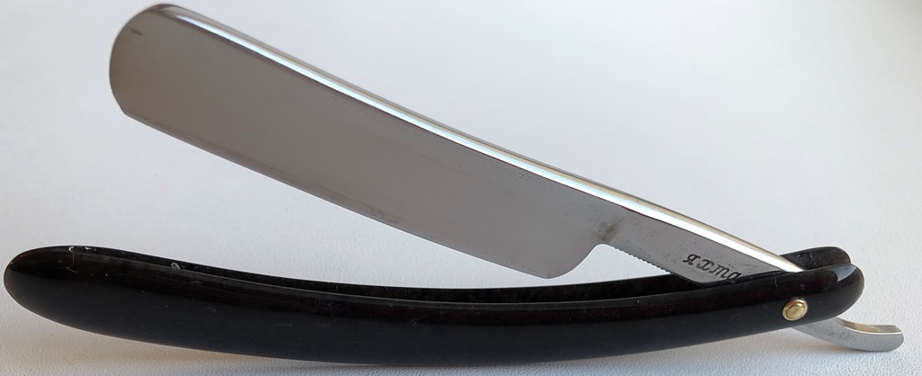Бритва в очень хорошем состоянии. Разобрал, немного освежил металл и снова собрал, поменяв пины на более надёжные втулки, со внутренними шайбами.Сталь и кромка чистые, без видимых дефектов. Оправа из натурально рога также в отличном состоянии для своих лет. Бритва мощная, тяжёлая, но в тоже время имеет по-французски элегантные очертания.Красивая и практичная бритва, способная выдавать качественное и мягкое бритьё. Заточена и готова к пользованию.