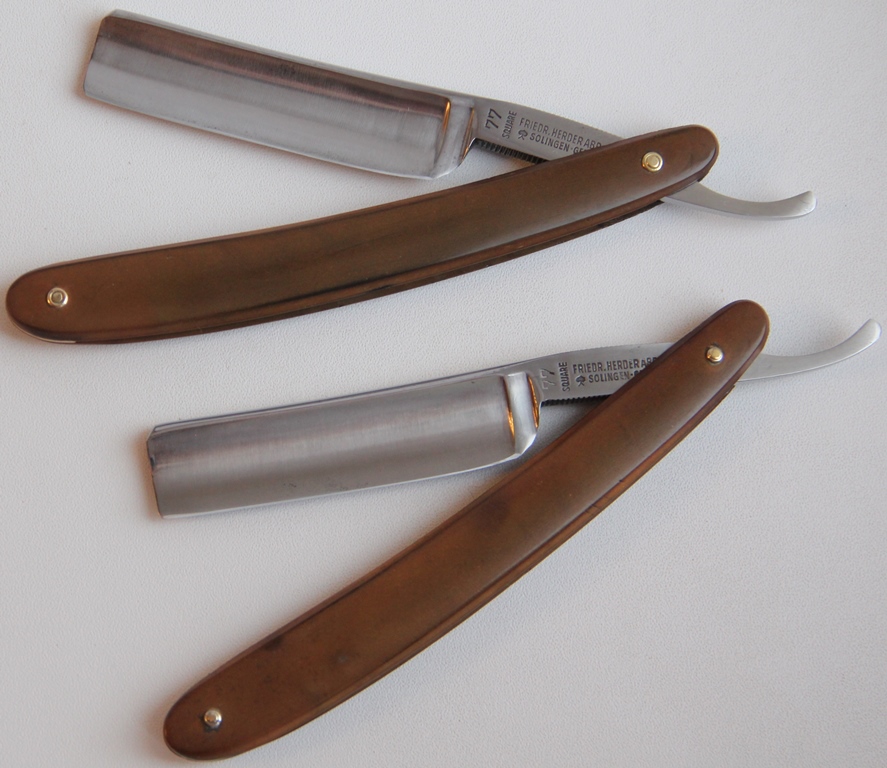 Бритвы находятся в совершенно нетронутом и исключительном коллекционном состоянии.Как будто только вчера с завода.Только оттер от остатков масла.Сталь и кромка чистые, без следов ржавчины , коррозии и окисления.Идеальная геометрия клинков:кромочки равномерны по всей длине и практически незаметны.Бритвы тяжелые. Как по мне, так идеальный вариант не только по красоте и своему коллекционному состоянию, так и прекрасный инструмент по прямому назначению.Эффектный эрль, с элементами ковки, удобная форма лезвия, вкупе со своей массивностью придают только положительные эмоции от пользования такой вещью.Осталось только три бритвы, которые не успели разобрать до того, как я выложил их на продажу. По желанию будут заточены и подготовлены к бритью.