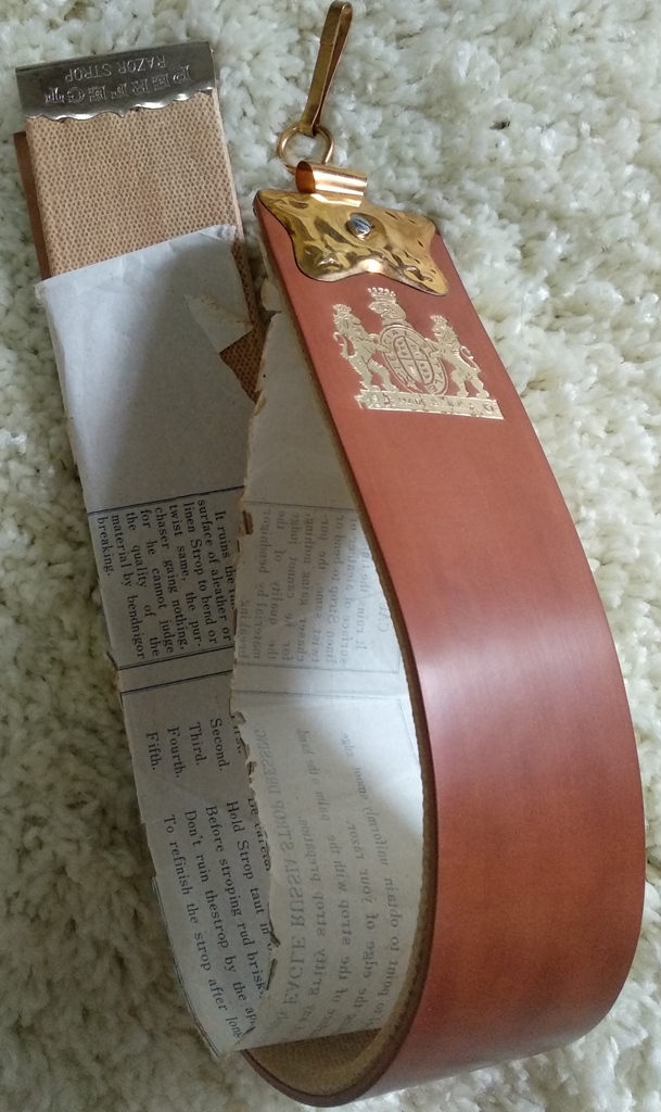 Ничего с полотном не делал, разве что протер пеной для кожи , убрав патину с поверхности.Следов пользования, в виде царапин, порезов и чего то другого не наблюдается. Видимо , ремень пролежал много лет без дела.Кожа и льняная стропа также мягкие и эластичные.Готов к работе.