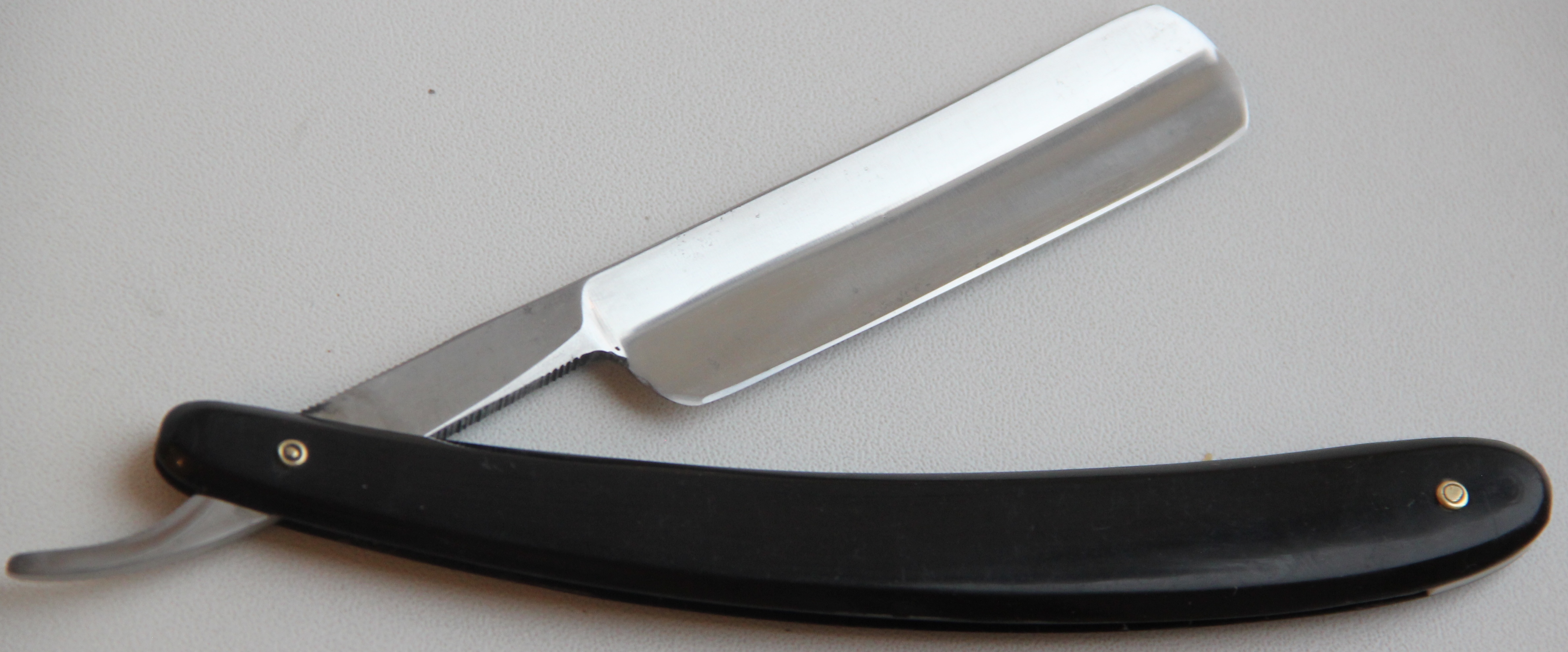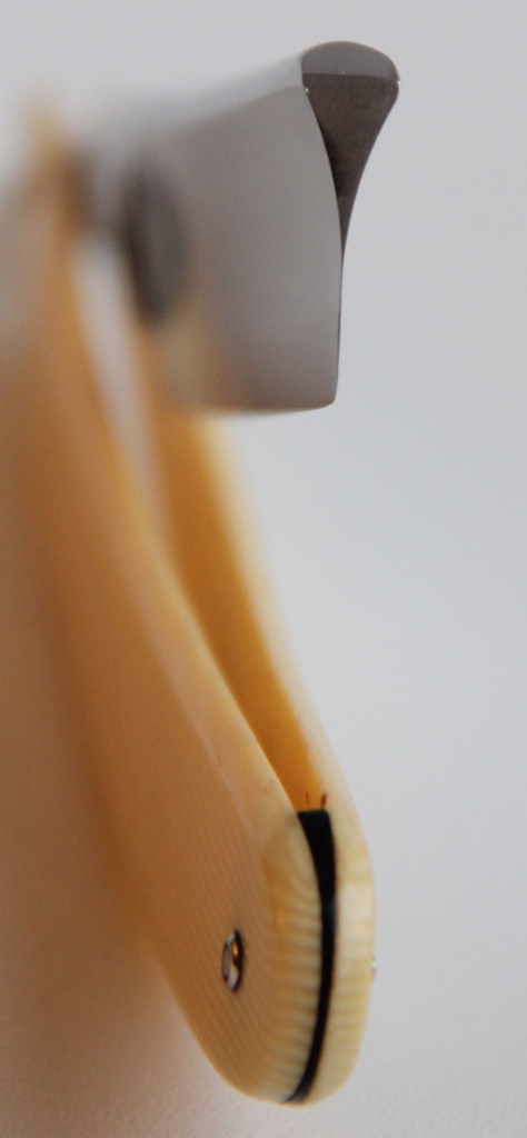 Бритва в очень хорошем состоянии. Разобрал, немного освежил металл и снова собрал, поменяв пины на более надёжные втулки, со внутренними шайбами.Сталь и кромка чистые, без видимых дефектов. Оправа из натурально рога также в отличном состоянии для своих лет. Бритва мощная, тяжёлая, но в тоже время имеет по-французски элегантные очертания.Красивая и практичная бритва, способная выдавать качественное и мягкое бритьё. Заточена и готова к пользованию.