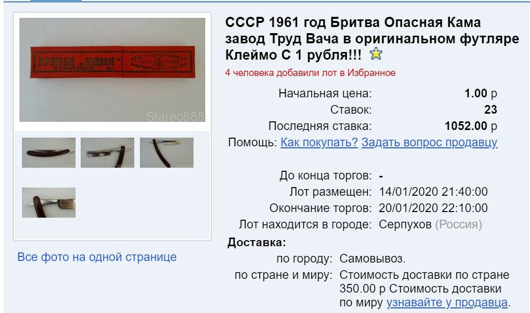 начальная цена 1 р дата окончания аукциона 19.01.2020 курс $ на 19.01.2020 = 61,53р итоговая цена 583 р или 9.47 $ в торгах участвовало 5 человек Spoiler Show аукционные цены на бритвы на российском рынкебритвы Спорт завода СТИЗ 1956г и безымянная.