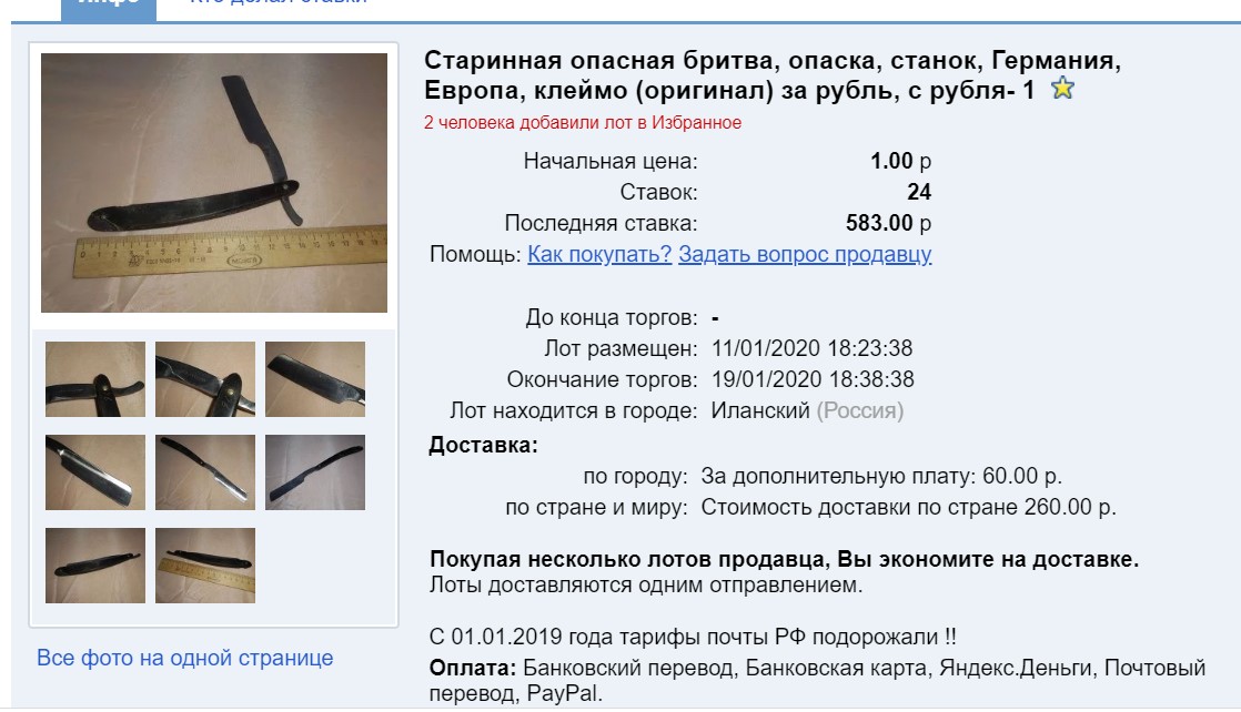 начальная цена 1 р дата окончания аукциона 21.01.2020 курс $ на 21.01.2020 = 61.46р итоговая цена 1130 р или 18.38 $ в торгах участвовало 7 человек Spoiler Show аукционные цены на бритвы на российском рынкебритва  Узкая, завод СТИЗ, 1956 год