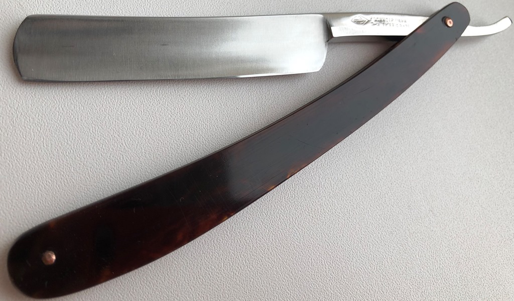 Бритва в очень хорошем состоянии , для своих лет.Мной не разбиралась, а если и разбиралась когда то, то очень давно, так как таких пинов сейчас не делают.Не уточена и имеет чуть заметные следы пользования.Сталь и кромка чистые, без дефектов.Родная роговая ручка также , в очень хорошем состоянии. Бритва миниатюрная, хотя достаточно увесистая, за счет своей формы лезвия. Подойдет не только для бритья, но и для коррекции усов и бороды.Можно порекомендовать опытным пользователям в качестве ещё одной в коллекцию, тем более вариант недорогой, но приятный во всех отношениях. Заточена и готова к бритью.