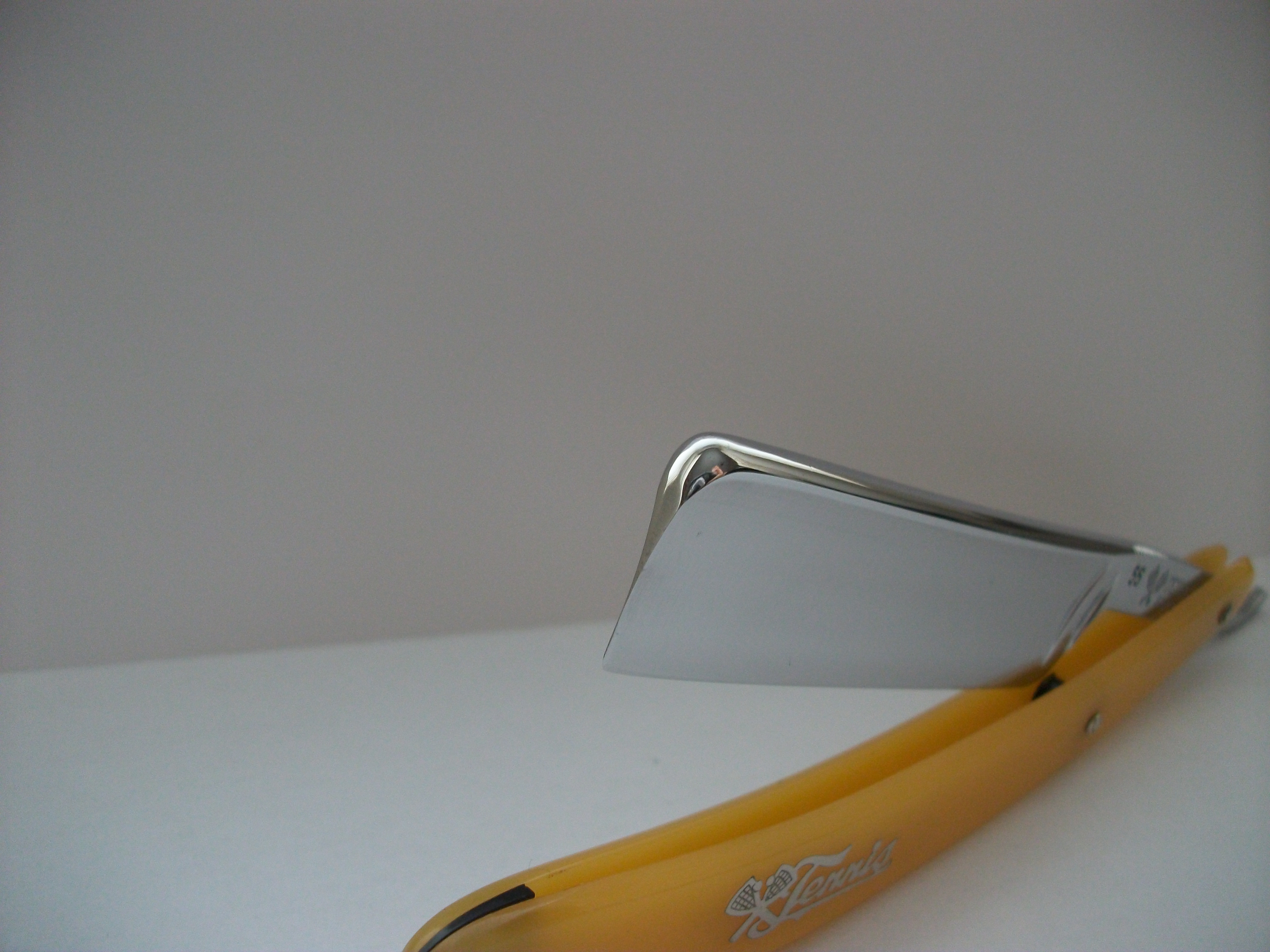 Экземпляр сочетающий такие несовместимые определения как Китай, качество, винтаж... Бритва имеет хорошую геометрию, углеродистая сталь, ширина полотна почти 21мм, длина режущей кромки 68мм, ручка пластик. Примерно 50-70 года ИМХО. Заточена и готова к бритью. Продано Spoiler Show