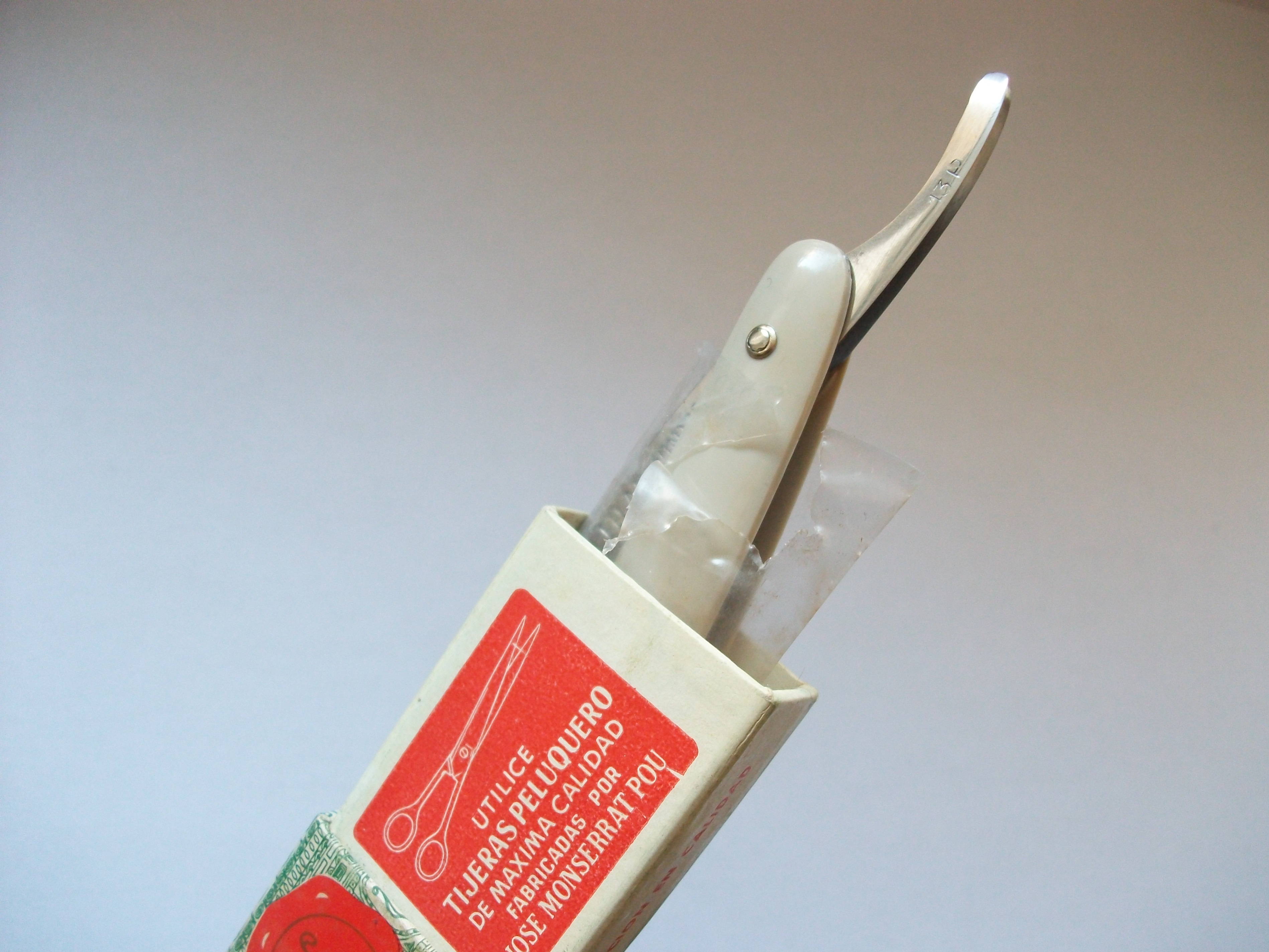 Абсолютно новая испанка. Углеродистая сталь, ширина полотна 21мм, длина режущей кромки 69мм. Ручка из пластика. Заточена и готова к бритью. Вид (в такой кондиции) занесен в красную книгу. Снято с продажи Spoiler Show