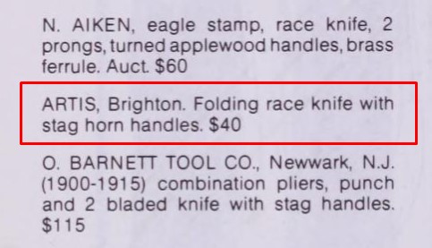в американском журнале "The antique tool collector's guide to value" (руководство для коллекционеров по стоимости старинного инструмента) за 1985 год, есть запись: Artis, Brighton складной ножик , 40$ ножик тоже нашелся, по виду конец 19 века: Spoiler Show