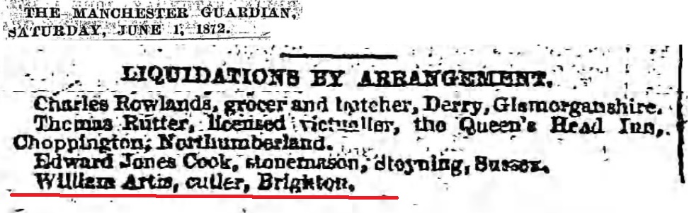 Spoiler Show William Artis из города Brighton, Англия, графство Сассекс. Начал бизнес до 1870 года (совместно с Georg Mitten). В 1871 году вышел из фирмы Mitten & Artis, в 1872 году обанкротился. До 1890 года начал новый бизнес по продаже ножей и бритв. Вероятнее всего в начале 1890х годов его фирма еще существовала. Больше упоминаний о нем в английских газетах нет.