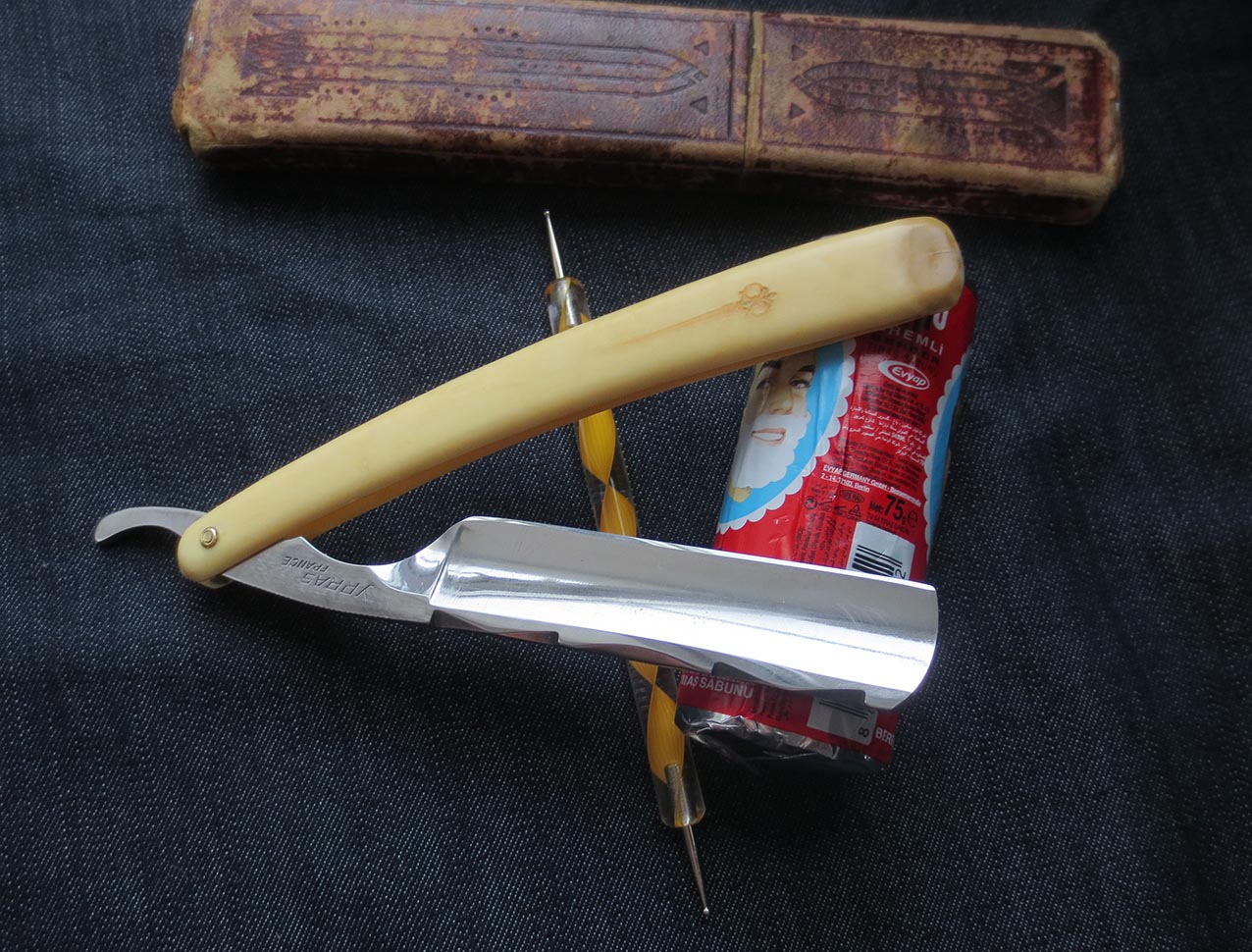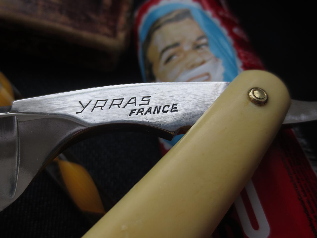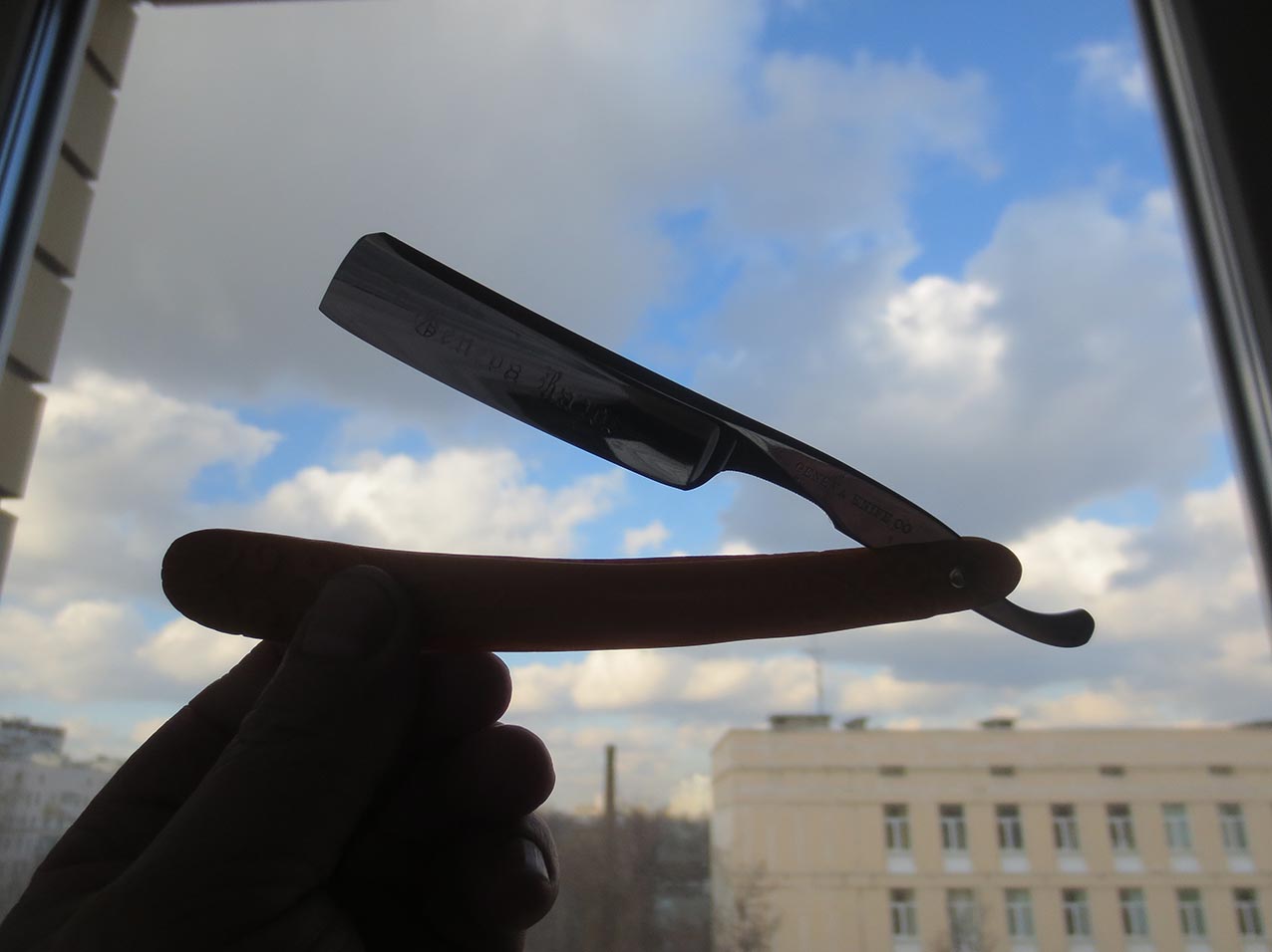 Французская опасная бритва YRRAS France. Производитель A. SARRY, ориентировочно 40-50е года. Углеродистая сталь, ширина клинка - 5/8 дюйма, родная однопиновая оправа с клеймом какого-то холодного оружия типа эспадрона, заклёпка - латунь. Бритва в отличном состоянии, заточена на японских водных камнях, направлена, продезинфицирована, полностью готова к работе и до покупки использоваться не будет. Купил и брейся! Также всегда в наличии ремни для правки опасных бритв из натуральной кожи (2000р) и при покупке набора почта по России за мой счёт. Начинающим подскажу и покажу по использованию и уходу за инструментом. Цена - 6200 рублей. Бесит, когда приходится пользоваться бритвой моложе себя...