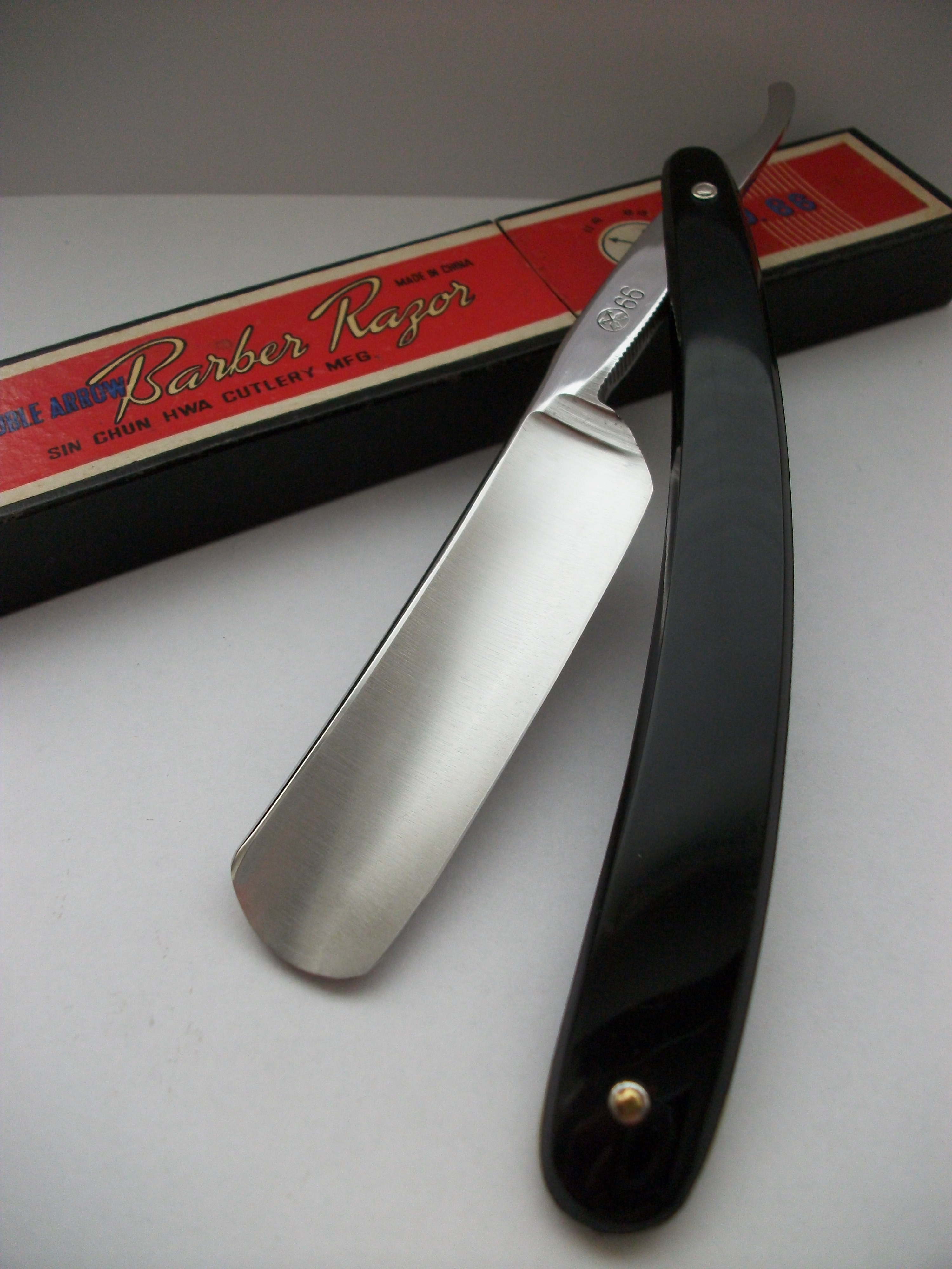 Экземпляр сочетающий такие несовместимые определения как Китай, качество, винтаж... Бритва имеет хорошую геометрию, углеродистая сталь, ширина полотна почти 21мм, длина режущей кромки 68мм, ручка пластик. Примерно 50-70 года ИМХО. Заточена и готова к бритью. Продано Spoiler Show