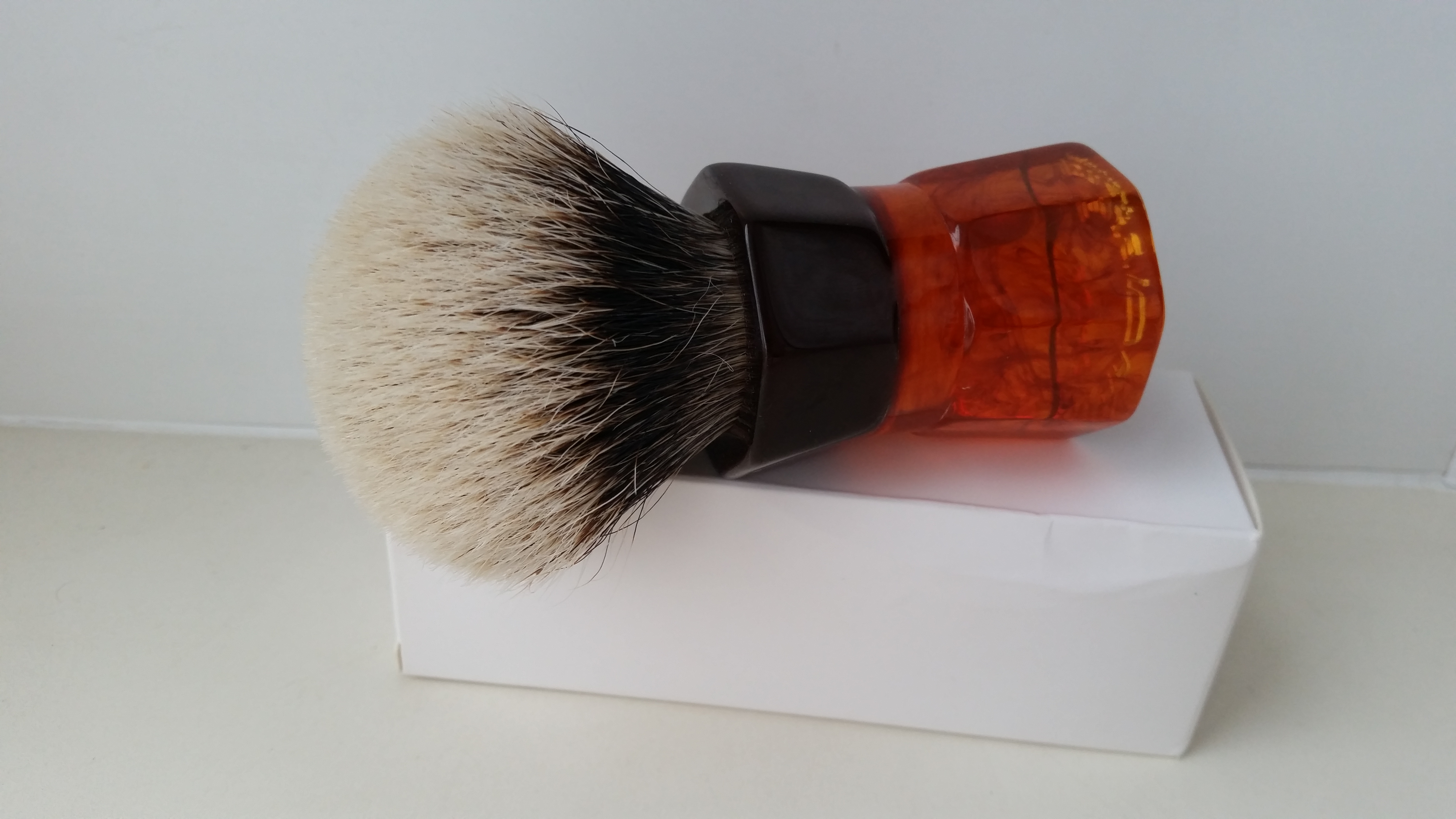 Красивая удобная ручка типа "многогранная под смолу", ворс натуральный двухполосный барсук, по плотности/упругости выше среднего, диаметр узла 26 мм, длина ворса 55 мм, ручка 56 мм. В оригинальной коробочке, б/у 2 раза (выпало 2 волоса при промывке и 1 при бритье), отлично бьет пену, приятен на лице, дает массаж, сильно пушится. Цена - руб.