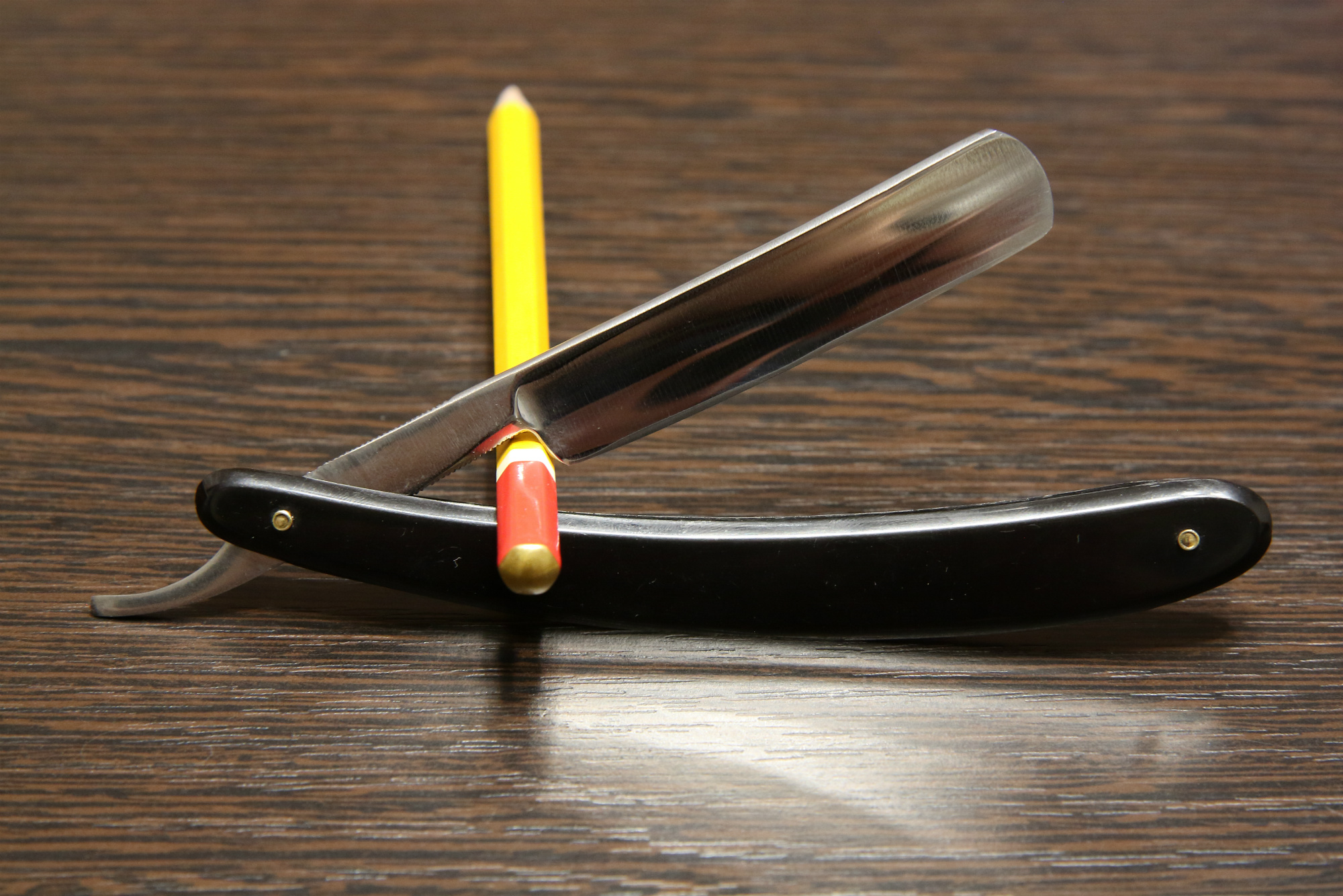 Опасная бритва Любительская, завод СТИЗ, 1956 год. Ширина полотна 17.5 мм, все родное в т. ч. футляр. Ко мне попала с заводской заточкой, но с некоторыми следами коррозии, чистил вручную, остались мелкие локальные следы времени (кромка чистая). Подготовлена мной к бритью, сталь довольно твердая. Любительская это редкая модель, выпускалась только в середине 50х, насечка на эрле сверху и снизу, "горбатая" линия обуха. Цена - руб.