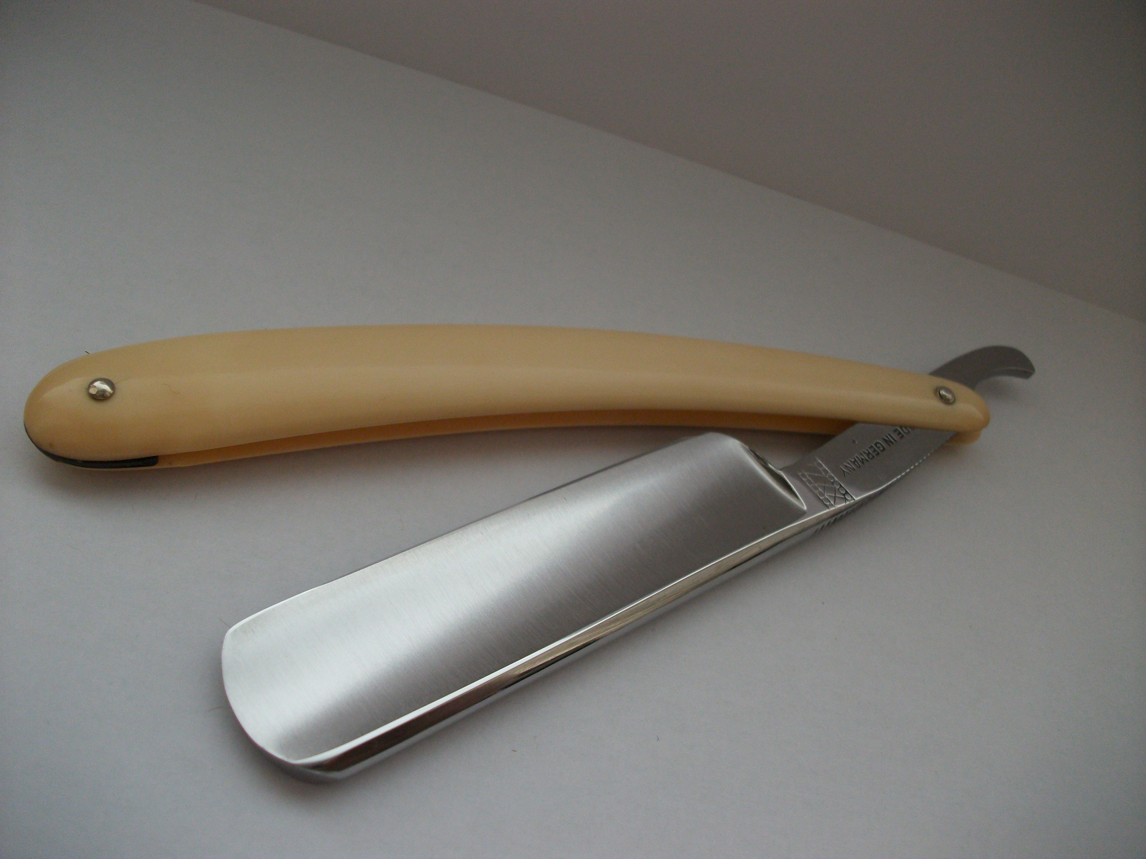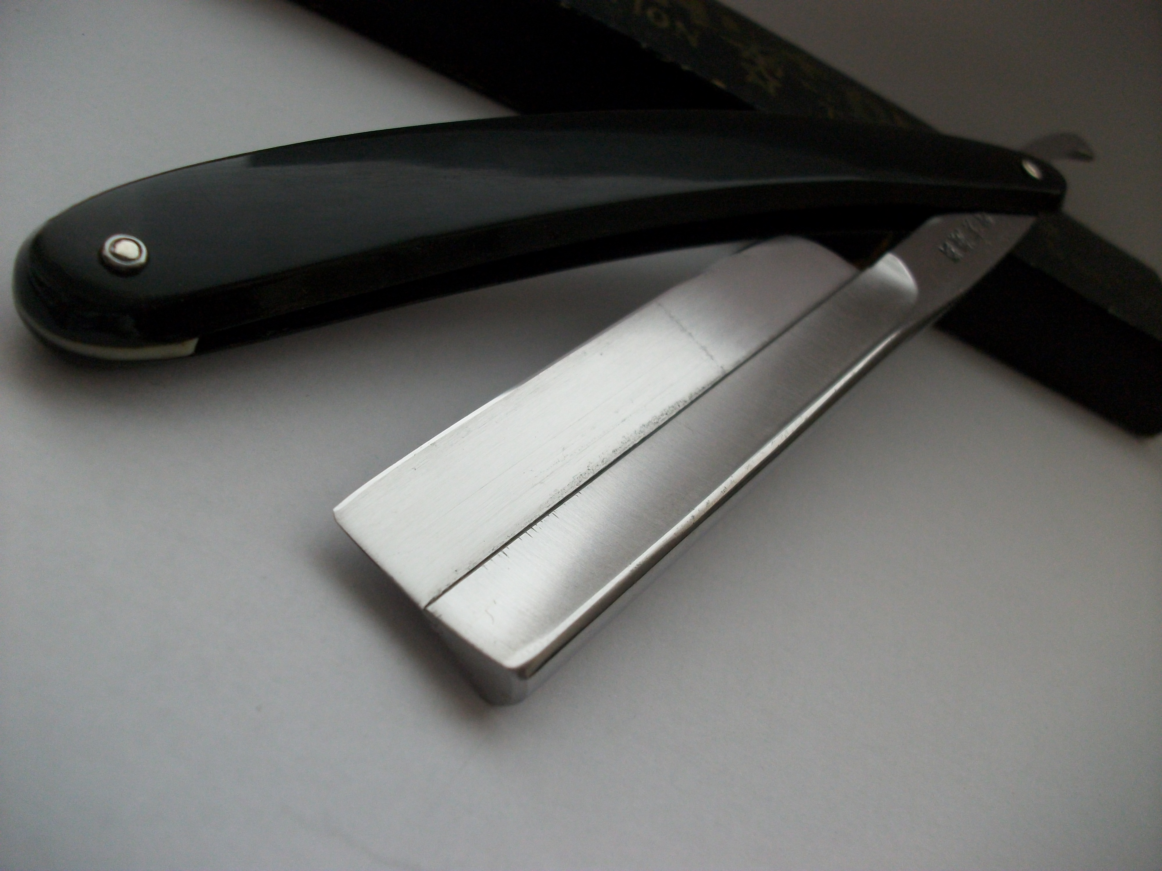 Клеймо в виде одного меча без короны встречается довольно редко. Клинок из углеродистой стали, ширина полотна 21мм, длина режущей кромки 74мм, ручка целлулоид . Думаю бритва изготовлена до 1950 года. Бритва заточена и готова к бритью.