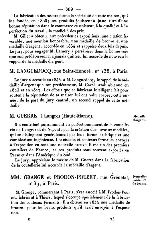 Жан Батист Герр (Jean Baptiste Guerre) родился 3.5.1788 в Лангре. Начал работать и получил выгоду от французской революции, чтобы основать свой бизнес и от наполеоновских войн, чтобы развить производство сабель, зажигалок и штыков... Герр был тесно связан с миссис Веуве Популус (Veuve Populus), с которой он, похоже, «ассоциировался» в ранние годы, и в итоге он сам стал мастером. В 1818 (по другим сведениям в 1812) году Герр основывает свое производство. С самого начала Жан Батист Герр демонстрировал тяжелую работу и упрямство: в 1819 году, например, он будет представлять свой город вместе с Популя Белин (Populus Belin) на выставке в Лувре (всего 2 представителя, тогда как Лангр в те годы мог похвастаться очень большим изобилием производств в этой отрасли). В 1923 году уже один он представлял Лангр на выставке в Лувре. До 1855 года он был на всех выставках, каждый раз медалист. вот немного упоминания в книгах, справочник от 1849 года, после получения очередной медали на выставке 1849 года. перевод: производитель ГЕРР, из Лангра (Haute-Marne) Он внес значительный вклад в улучшение столовых приборов Лангра и Ножана, создав новые модели, которые обычно отличаются своей художественной формой и оригинальным сочетанием. Ножницы и закрывающие ножи, отправленные на выставку, являются еще одним доказательством. Он был одним из первых ножовщиков во Франции, и его продукция часто экспортировалась в Персию и Южную Америку. В 1855 году, после первой всемирной выставки в Париже (Наполеон III был впечатлен лондонской выставкой в 1851 году, захотел провести свою) Наполеон хотел наградить достойных промышленников, получивших медаль на выставке 1855 года в Париже, чтобы показать свое величие и качество производимых товаров промышленностью Франции, тем самым утерев нос англичанам, после их выставки 1851 года. Жан-Батист Герр был посвящен в рыцари императорского ордена Почетного легиона, с этого момента он начал изображать крест легиона на своих бритвах (а также императорскую корону, которую можно найти на многих бритвах XIX столетия). Это императорский указ от 10 февраля 1856 года: В начале 1860-х годов бразды правления компанией переходят от Жана Батиста к его сыну - Шарлю Герру. Именно Шарль Герр взял медали на выставках 1862, 1867, 1872 годов. Жан-Батист Герр умрет 14.12.1963 К концу жизни Шарля Герра, в конце 1860-х и начале 1870-х годов, возникло небольшое противоречие: рабочие Ножана пожаловались (я так понимаю из-за того, что хотели признания своей работы, а учитывая то, каким крупным и богатым было производства Герре, это выглядит логичным), что с 1860-х годов компания Герра не делала бритвы в Лангре, которые на самом деле производились работающими семьями Ножана, а компания, в свою очередь, обеспечивала только сырье и «контроль качества». И, если я правильно понял, рабочие семьи Ножана создали кооператив и имели небольшое соперничество в качестве с производимыми бритвами в Лангре. Помимо самого бренда «Guerre fils», Шарль указывает на бритвах города производства как Nogent так и Langres с 1870-х годов. Шарль Герр умер в 1876 году, и компания перешла к его племяннику Эмилю Женевуа - Герру (Emile Genevoix - Guerre), который также будет производить в Ножане, городе, который в то время имел худшую репутацию в сфере столовых приборов. В 19 веке в Лангре компания Guerre была самым важным и лучшим производителем столовых приборов высокого и высшего качества (класса люкс).