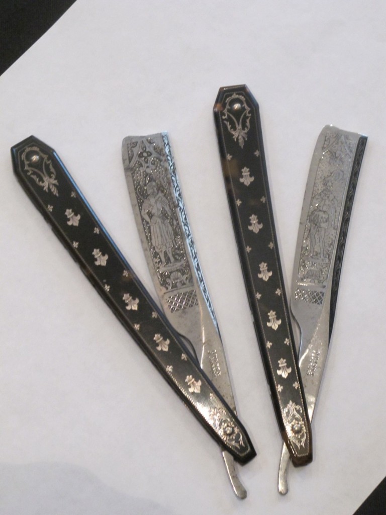 Так же погулял по сети и позаимствовал немного фото у французского форума. Есть пара музейных бритв из Лангра и еще один Guerre в черепахе. Производитель явно неординарный, видно по качеству исполнения. Кроме того спрос на бритвы Guerre стабильно высокий, не раз видел как торги на ебэй доходили до внушительных сумм. Мне, как и писал выше, моя пара досталась исключительно из за привередливости продавца, который не отправлял за пределы Франции и не принимал других способов оплаты кроме чека. История занимательная. Пришлось в итоге просить своего знакомого во Франции чтобы он выписал чек, отправил его в письме, а после сходил на почту для получения и переслал бритвы на мой адрес в Россию. За что ему огромное спасибо.