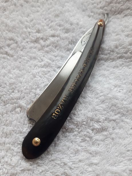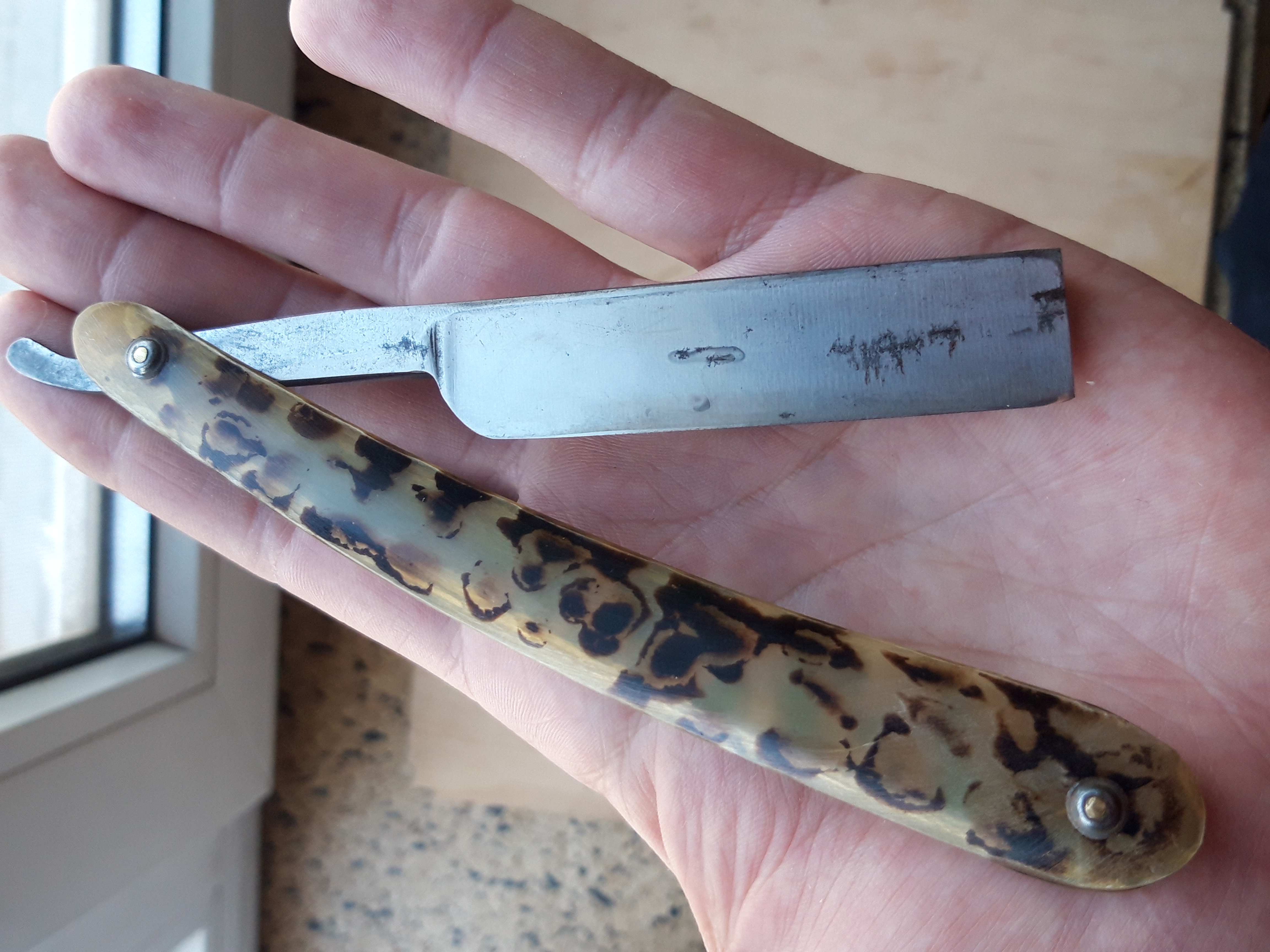 Красивая, Улыбчатая бритва. Имеется патина и небольшие продольные царапины (Не Я). Ручка слон. Клинышек - олово. Бритва имеет заводской гринд и блеск. Камней не видела. Геометрия на высшем уровне! Достойный экспонат. Не заточена. Фраза "Под восстановление", почему-то, язык не поворачивается сказать. Продана.