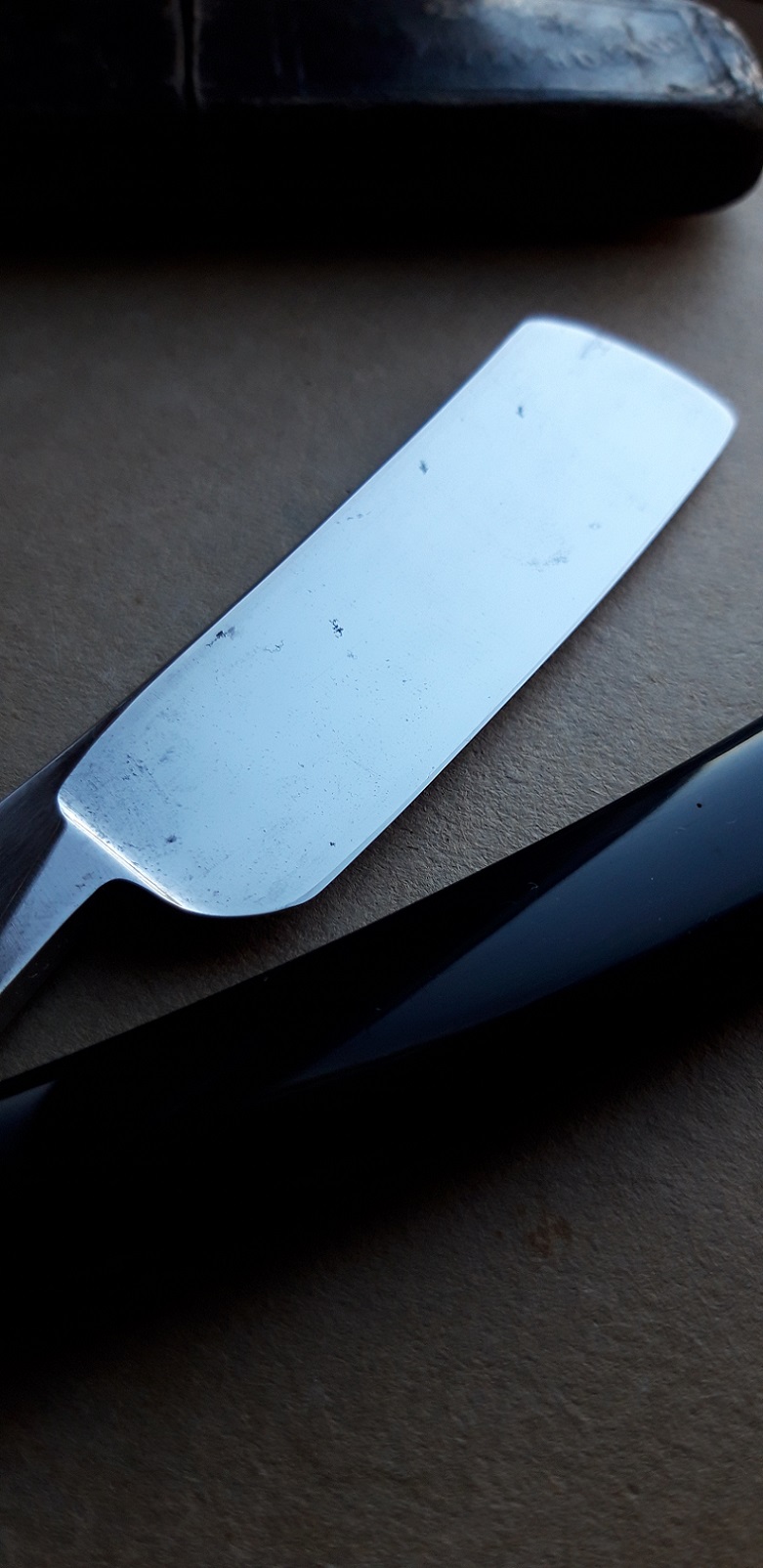 Клин. 20 мм. Обух более 6мм. Увесистый экз. Нос - танкерный. Ручка рог родная, мощная, в идеале. Клинышек олово. Бритва в использовании не была. Единственное, немного времени осталось возле обуха. Абсолютно ничего страшного. Бритва прошла через хорошие руки Дядюшки Фантомаса. Заточка тоже его. За что ему огромная благодарность! Продана.