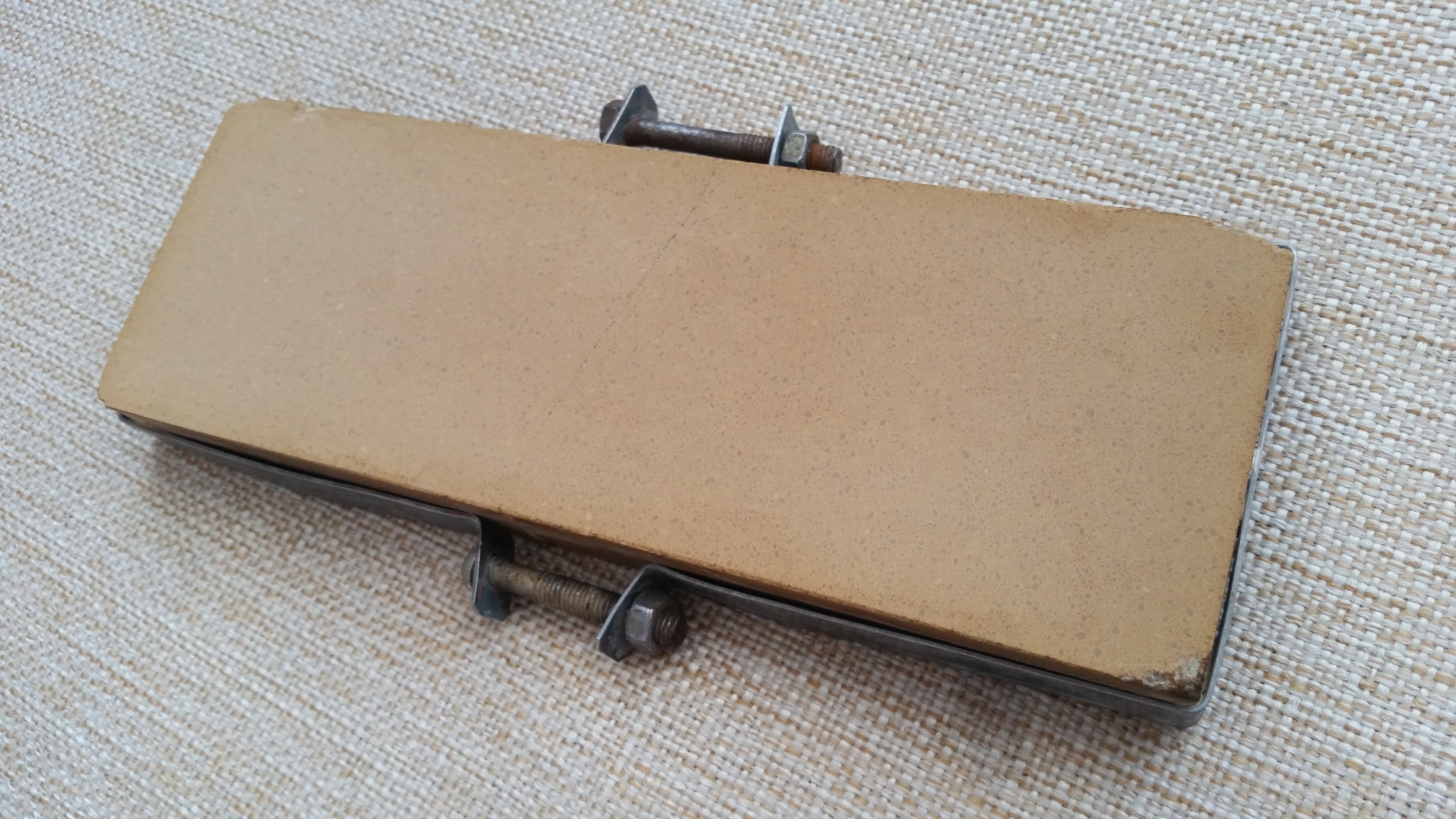 Синтетический японский водник King, зернистость 4000 по JIS, старого производства (сейчас именно такие не делают). Куплен на аукционе в Японии. Размеры 210х70х22 мм. Раскололся пополам от падения, сделал ему стяжку из оцинковки и подготовил поверхность. Трещина забьется суспензией и будет работать штатно. Есть скол одного угла и скол на одной грани, на фото видно. Связка бакелитовая, много воды не пьет, сохнет быстро. Использовал его с суспензией (ботан или синтетический слурик) после 1000 для затирания рисок, справляется за 6 - 7 минут и готовит кромку к тонким природникам или 8000 синтетику. Вообще, отличный камень, после его раскола, заменил его суитой, поэтому к нему так и не вернулся. Цена - руб.