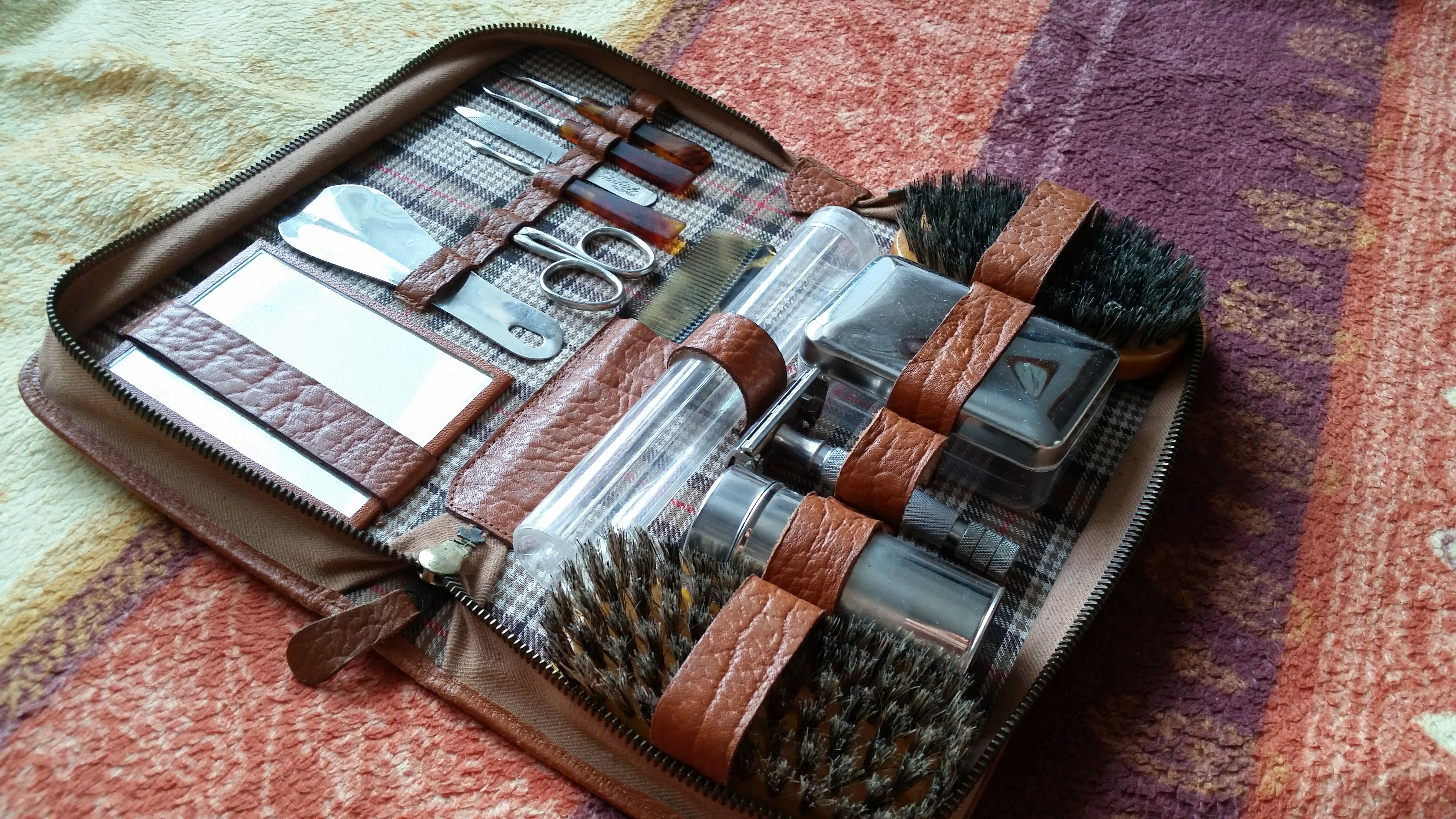 Несессер настоящего джентльмена из прошлого. В комплекте т-станок Gillette Rocket (конструкция бабочка, полностью рабочий, сделал ему дезинфекцию Стериллиумом), две щетки, металлический тубус с помазком, емкость под мыло, длинный прозрачный тубус, расческа, зеркальце, ложка для обуви, инструменты для маникюра (ножнички, пилочки, лопаточки и т.д. с маркировкой Made in Germany или "Solingen"). Все это находится в сумочке под кожу на молнии, состояние всех вещей хорошее (все предметы оригинал и из тех времен). Несессер был куплен в г. Бонн, Германия, потом привезен сюда (было это все до появления коронавируса). Шикарный винтажный комплект, можно не только бриться и ухаживать за собой, но и получать эстетическое наслаждение от обладания и созерцания данной вещи. Цена - руб.