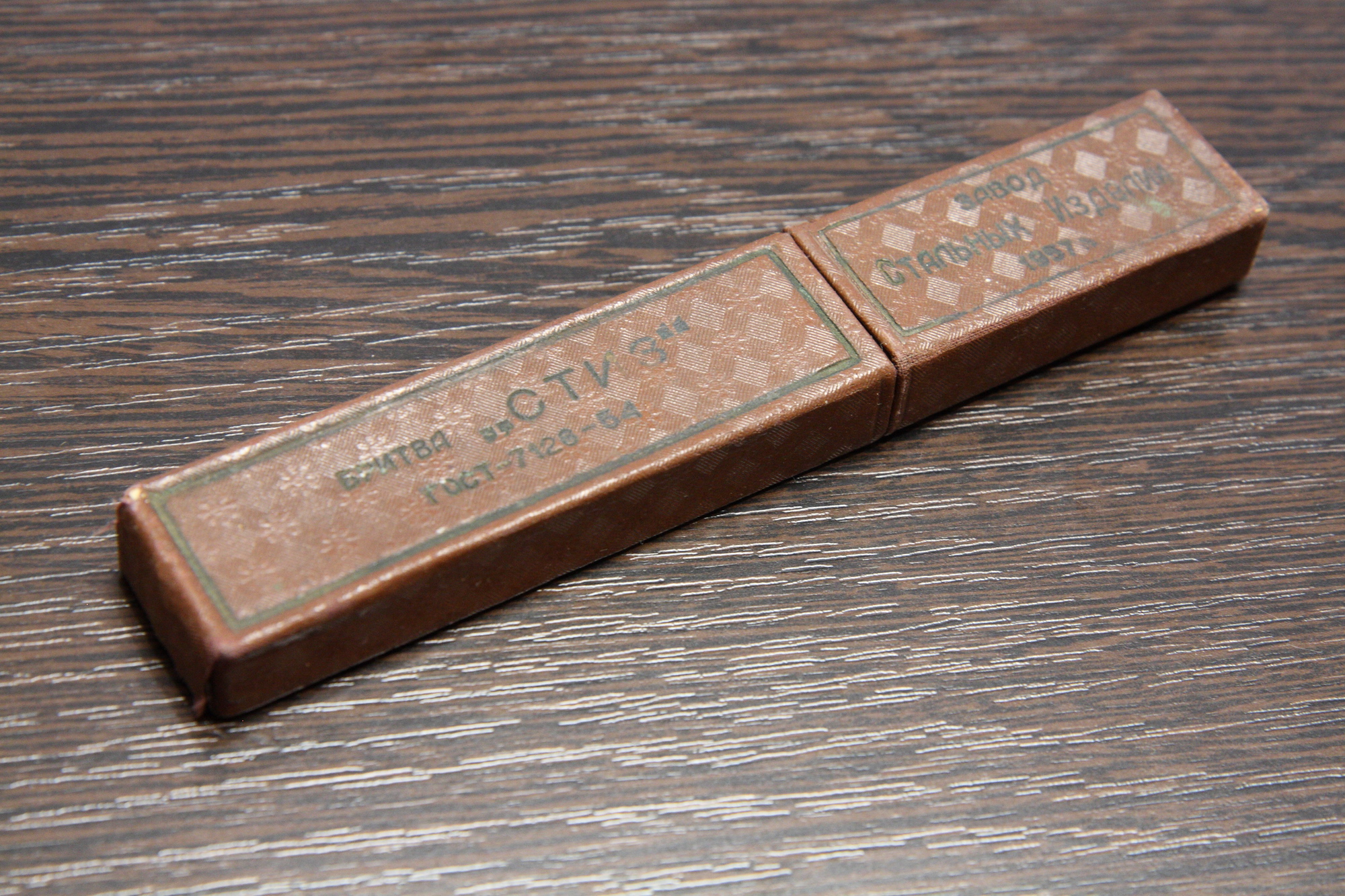Опасная бритва завода Труд Вача, 1948 год. Ширина полотна 16 мм, все родное, футляр тоже (но очень плохо сохранился). Бритва пришла с пятнами коррозии, почистил полотно вручную (остались некоторые следы, но кромка чистая) и заточил, подготовлена мной к бритью. Отличный представитель старых советских бритв с шикарной сталью и профилем полуклин - уничтожителем густой жесткой щетины. Такие бритвы сейчас редкость. Цена - руб.