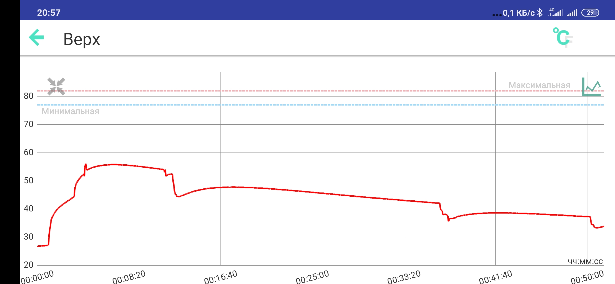 Кружка для бритья из силиконаЕсли будет кому интересно. Обоснованный подход к новому изделию. Сегодня пытал новорожденного (новый скаттл) в микроволновке. Мне показалось, что это хороший вариант. 2 минуты нагрева дали 72 градуса теплоносителя(воды в рубашке скаттла) Далее бритьё в 3 захода.. совсем не торопясь, за 50 минут... В конце пена подостыла, но была все равно 35 градусов. Пена при этом не была перегрета и не сохла. Исходя из принципа разумной достаточности, думаю в геометрии, количестве теплоносителя ничего не менять.Завтра попробую 3 минуты в микроволновке, а значит теплоноситель 100 Верхний график-изменения температуры пены, нижний-воды