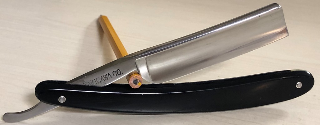 Бритва находится в прекрасном состоянии, с еле заметными следами пользования.Разобрал, поменял пины и заодно немного освежил клинок от патины.Идеальная геометрия полотна:кромочка равномерна по всей длине.Сталь чистая от разного рода видимых дефектов.Практичная, красивая, мощная бритва, созданная в традиционном японском стиле евро-бритв.В принципе, для новичка( и не только) ничего другого и не нужно. Бритва относительно недорогая, но перспективная, с прекрасной "звенящей" сталью и отменным качеством изготовления.Заточена и готова к бритью.