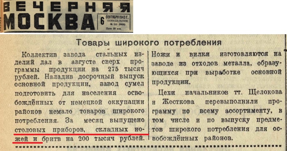 К сожалению, ни складных ножей, ни тройчатки изготовленных в середине-конце 40х не пока найдено.