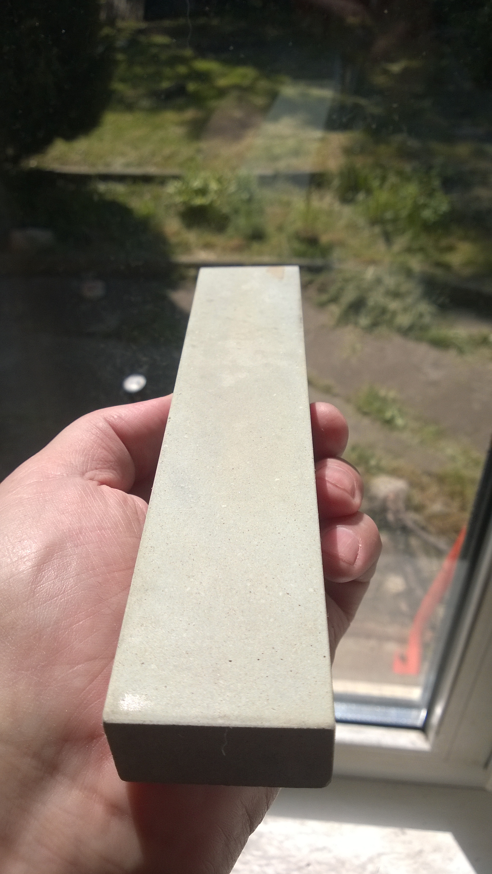 Добыча с барахолкиВот такой камень купил за 4 бакса. Камень был весь чёрный и по началу я подумал, что это песчаник Berean, который у меня уже имеется (типоразмер один в один), но после доводки его до ума он поголубел (типа светлая глина). Диапазон от 1000 до двух, а может и больше. Кстати. продавец неделю не выкладывал камень, ждал, когда я появлюсь на барахолке