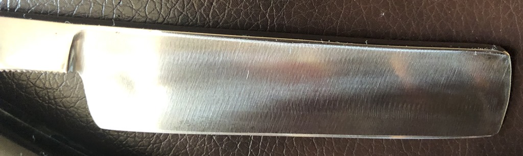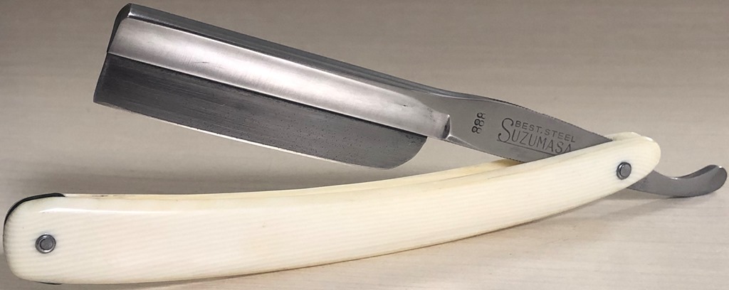 Итак,SUZUMASA 888.(寿々正 = Suzu Masa). Ширина полотна-21 мм Толщина обушка-6.3 мм Углеродистая, по всей видимости шведская сталь. Форма лезвия-фреймбэк. Время производства-50-60-е годы. Клинок имеет малозначительные и практически незаметные следы пользования. Разобрал бритву, немного почистил район осевого пина и обушок и снова собрал, сохранив родные пины. Заводская шлифовка и полировка полотна.Сталь чистая, с элементами благородной , старинной патины.Идеальная геометрия:кромочка равномерна по всей длине и еле заметна.Тяжёлая, мощная и красивая бритва будет отличным вариантом для тех, кто имеет желание попробовать подобную форму лезвия.Заточена и готова к бритью. Цена-6500 р с доставкой. Внимание! Важная информация! Spoiler Show
