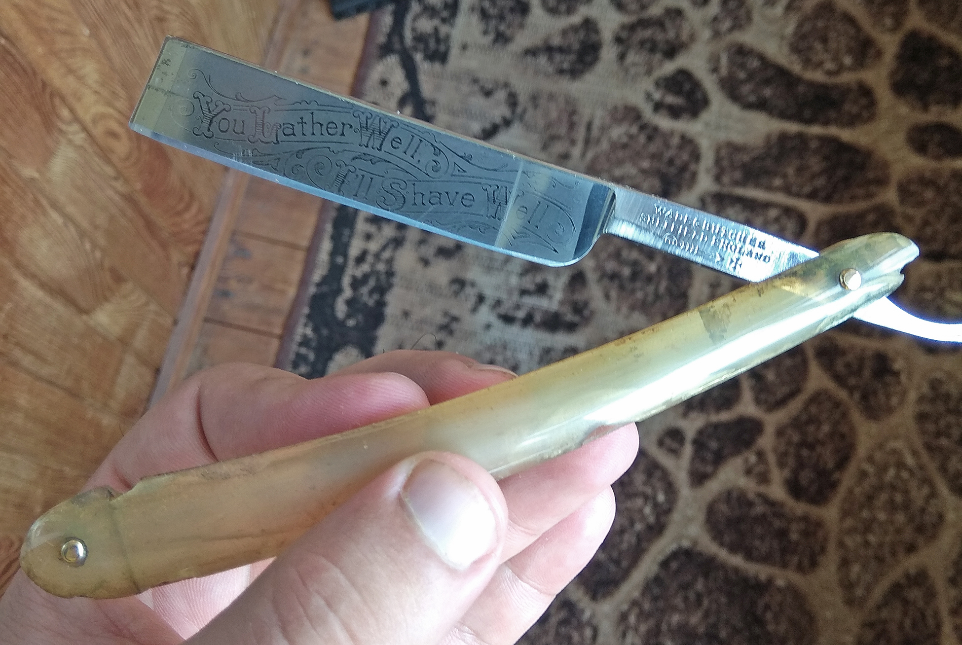 Насколько я знаю, это старая английская бритва из Шеффилда. По словам продавца, это конец 19 века. Но почему она такая "толстая", семь с небольшим мм, я имею в виду толщина обуха? Интересует примерный возраст и стоимость. Рукоять из рога, всего одна небольшая трещинка у пина. Да и вообще, накидайте информации побольше!