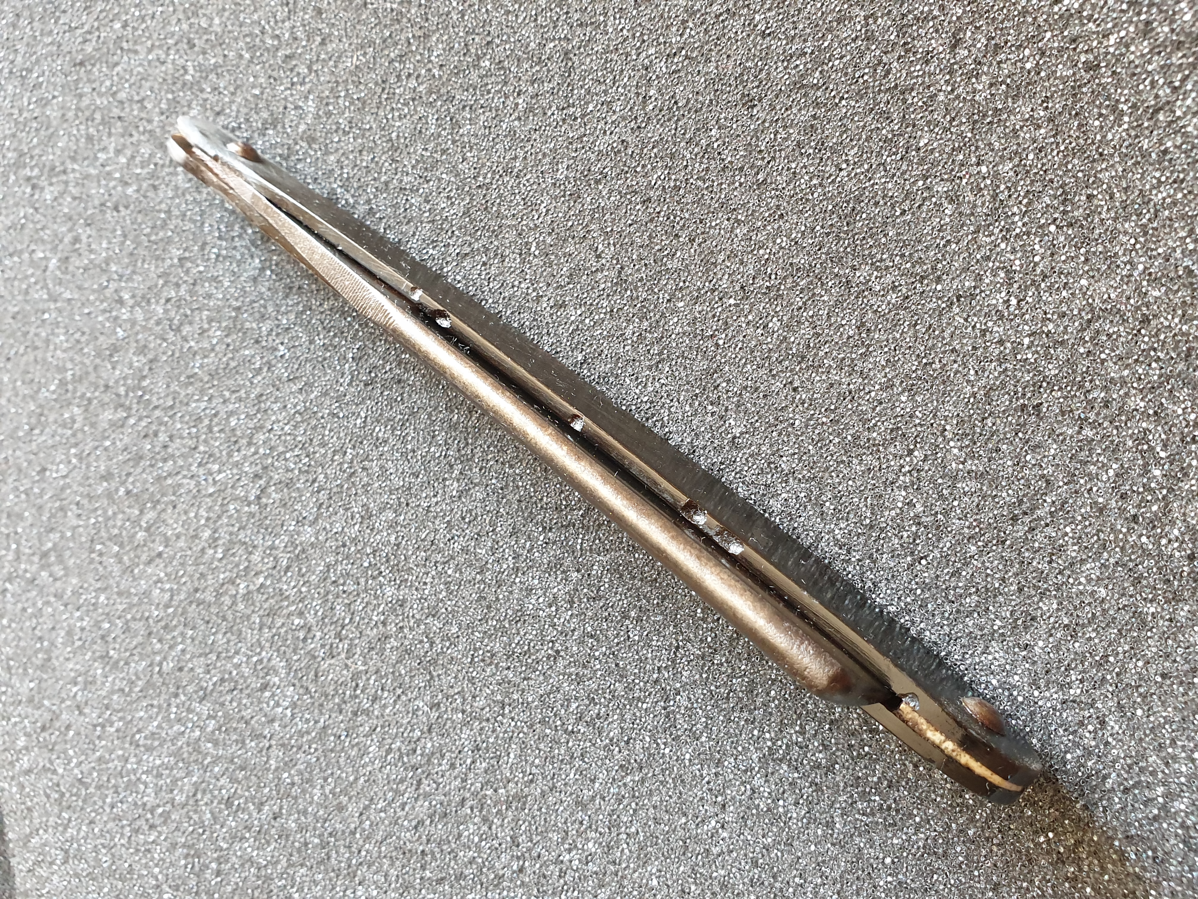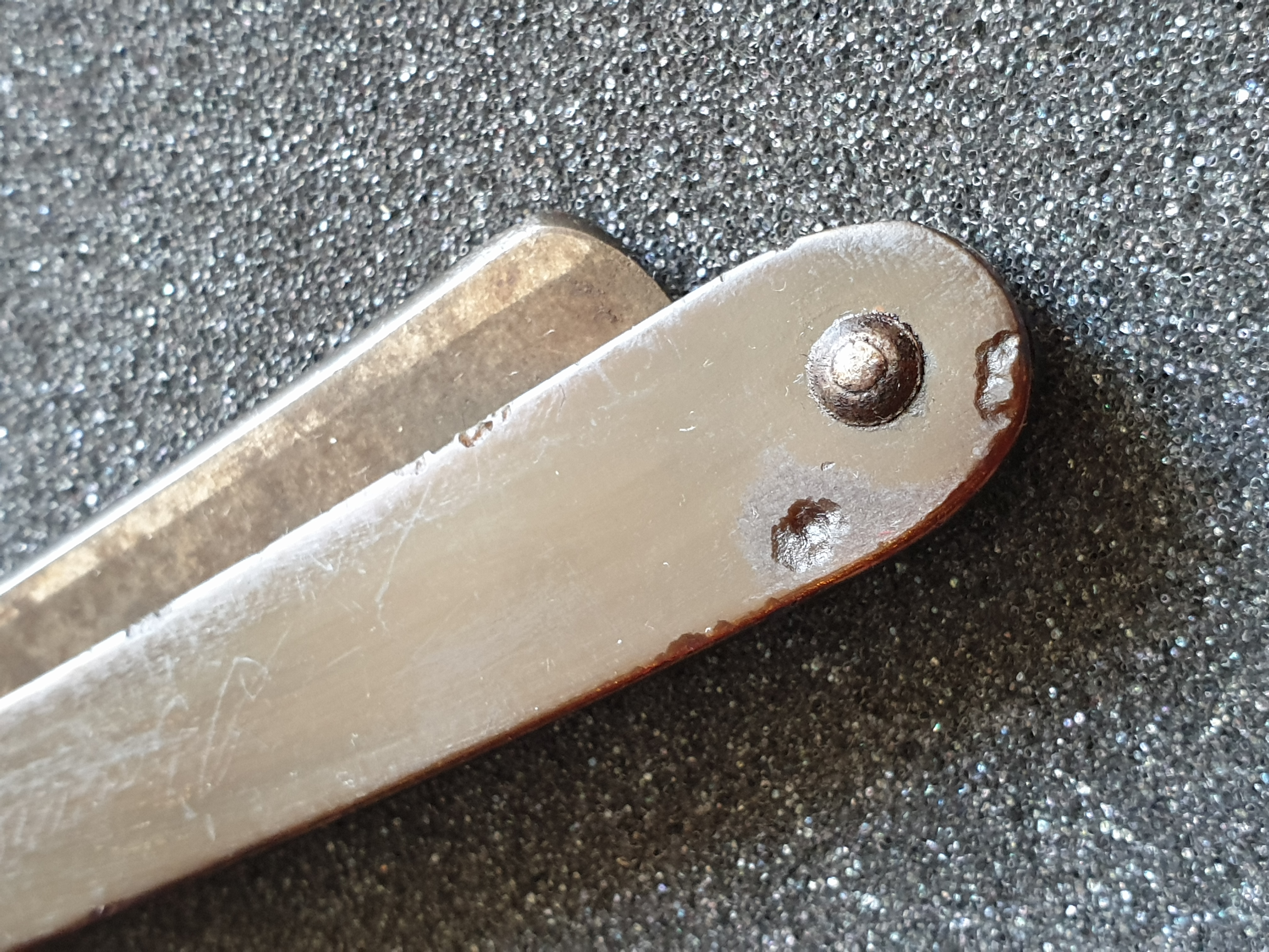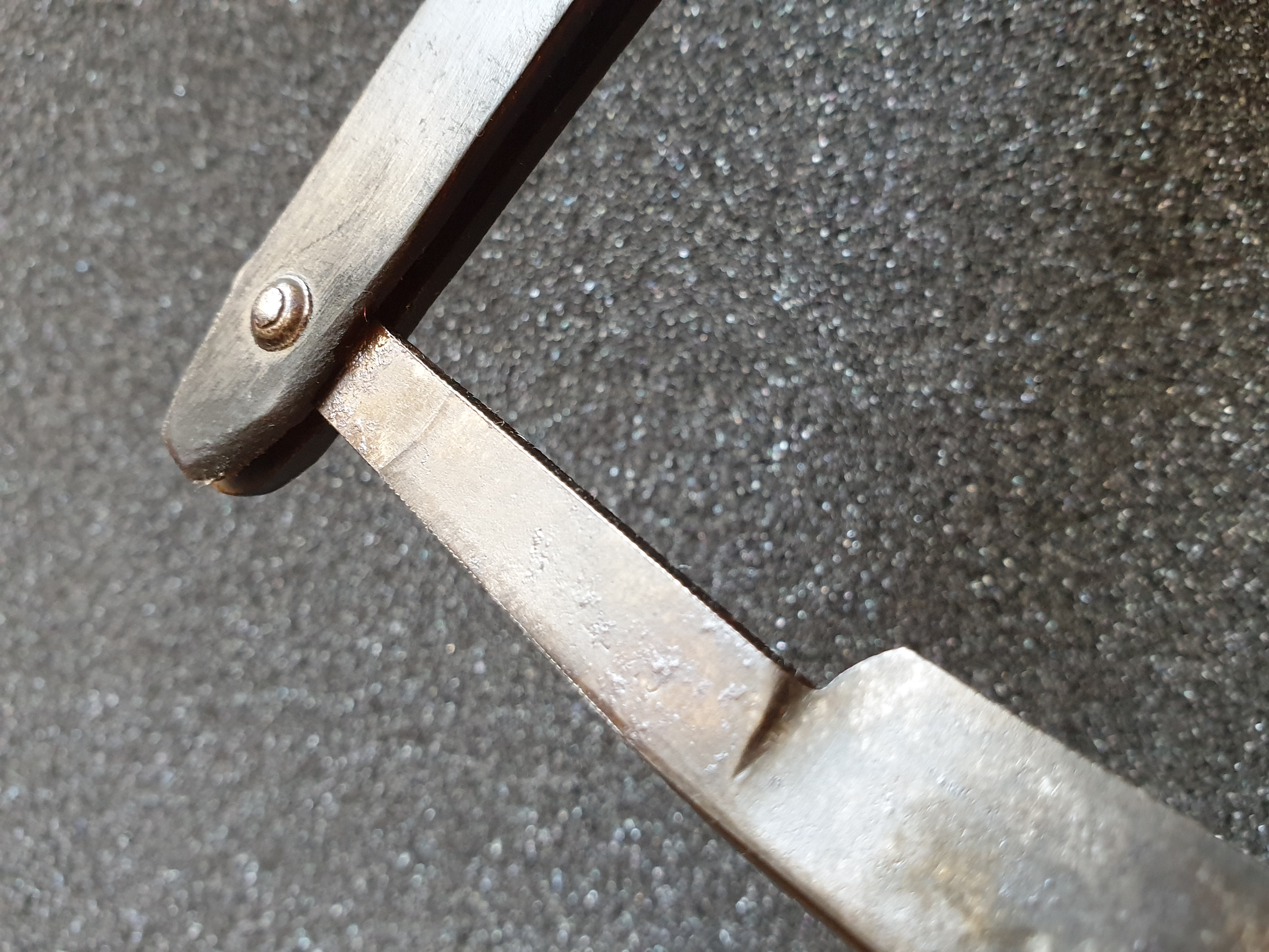 Продаётся от S&T67. Винтажный французский бесхвостый клин, под восстановление. От клейма остались полунамеки на пару букв. Ширина клинка 16мм. Ручка из рога, в весьма хорошем сохране, крепкая, пины - железо, с внешними шайбами типа "бычий глаз". Мелкая насечка на эрле с обеих сторон. Все родное, бритва не разбиралась, клинок паркуется в ручку по центру, без перекосов.