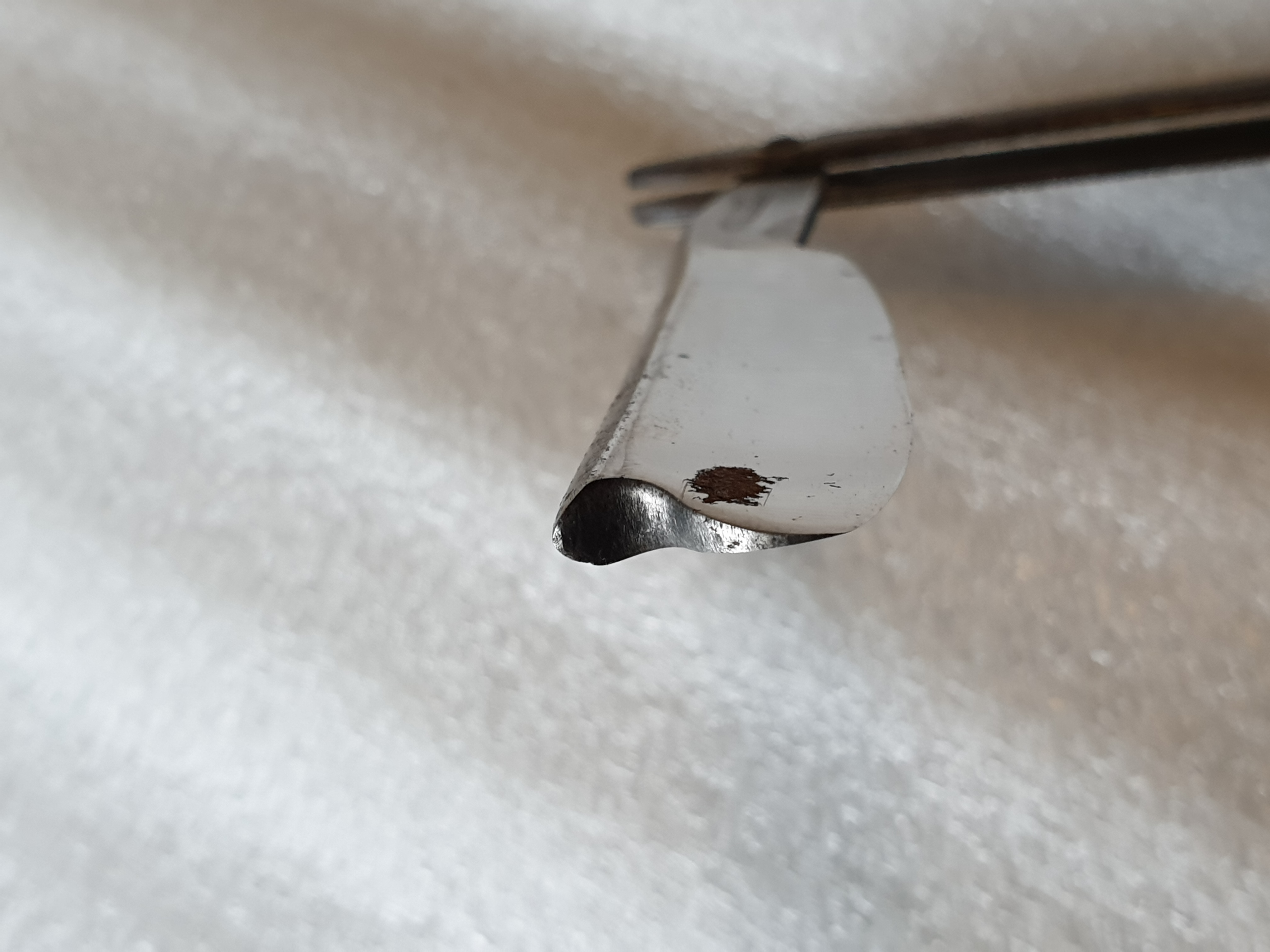 Продаётся от S&T70. Французский клин под восстановление, продается "как есть". Ширина клинка 20мм, без следов уточенности, заводская геометрия, чистые грани, клеймо читается полностью. Ручка из рога, ровная, крепкая, выгрызы по краям. Клинок паркуется в ручку с небольшим закосом. Все родное, бритва не разбиралась, смыта грязь моющими средствами и протерта ручка костным маслом.