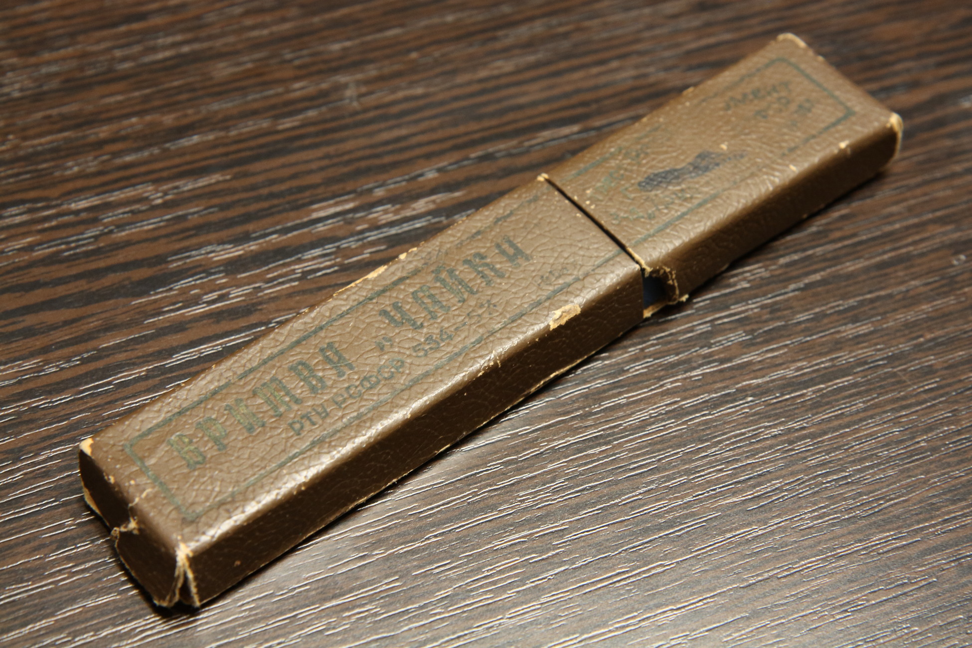 Опасная бритва Москва, завод СТИЗ, 1953 год. Гравюра на полотне "Крымский мост". Ширина полотна 17 мм, все родное (кроме головного пина и внутренних шайб), футляр-сундучок родной. Немного почистил вручную полотно пастами чтобы освежить металл, при этом сохранил гравюру, остались некоторые мелкие следы (совсем чуть). Подготовлена мной к бритью. Красивая бритва конца сталинского периода с приятной синей ручкой, характерной для 53 года и немного для 52го. Пойдет для мягкой щетины, для жесткой слаба. Цена - руб.