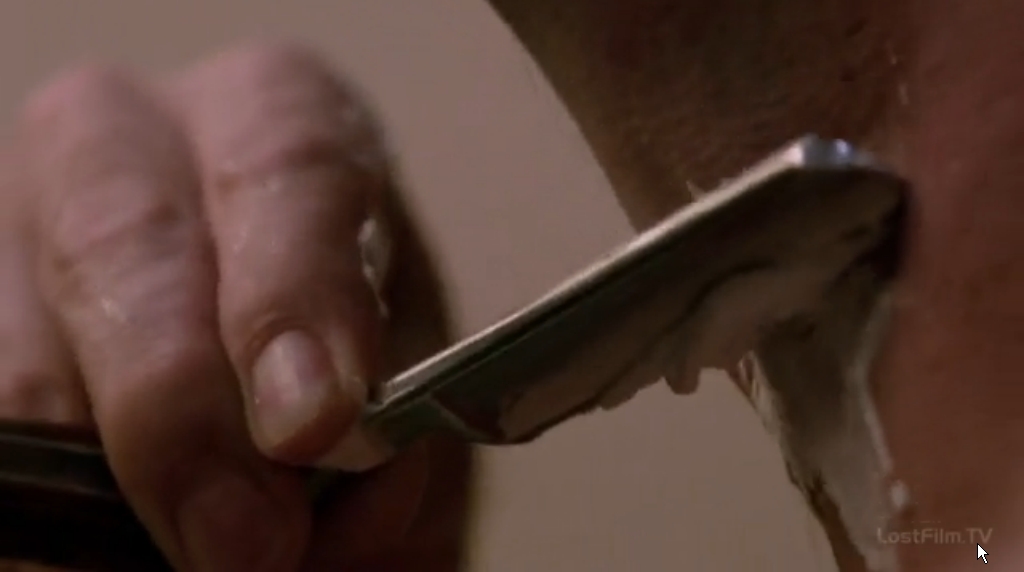США Создатель Кевин Уильямсон В ролях: Кевин Бейкон, Джеймс Пьюрфой и др. Ссылка с привязкой ко времени не могу дать, потому что на ютюбе не нашел ни целого фильма ни этого отрывка. Вот ссылка на 5 серии из 2 сезона фильма на другом ресурсе (смотреть с самого начала, с 1м.32с.): http://seasonvar.ru/serial-8533-Posledo ... sezon.html О самой сцене: Серийный убийца (Джеймс Пьюрфой) править и бреется опасной бритвы. Для брутальности сцены во время бритья убийца порезался и смыл кучу крови с бритвы. Ксати озвучка бритья очень сильная. Сама сцена пестрит ошибками: 1. Во время правки обух бритвы не касается ремня и бритва сильно звенит. 2. Процедура бритья выполняется поперек кожи (особенно в конце). 3. Кровь с бритвы смывается в таком количестве, как будто курицу зарезали. 4. И наконец, мокрая бритва бросается на мокром подносе в бане. Полный капец! С 2013 г. с кайфом бреюсь опасной бритвой пять раз в неделю, в три прохода.