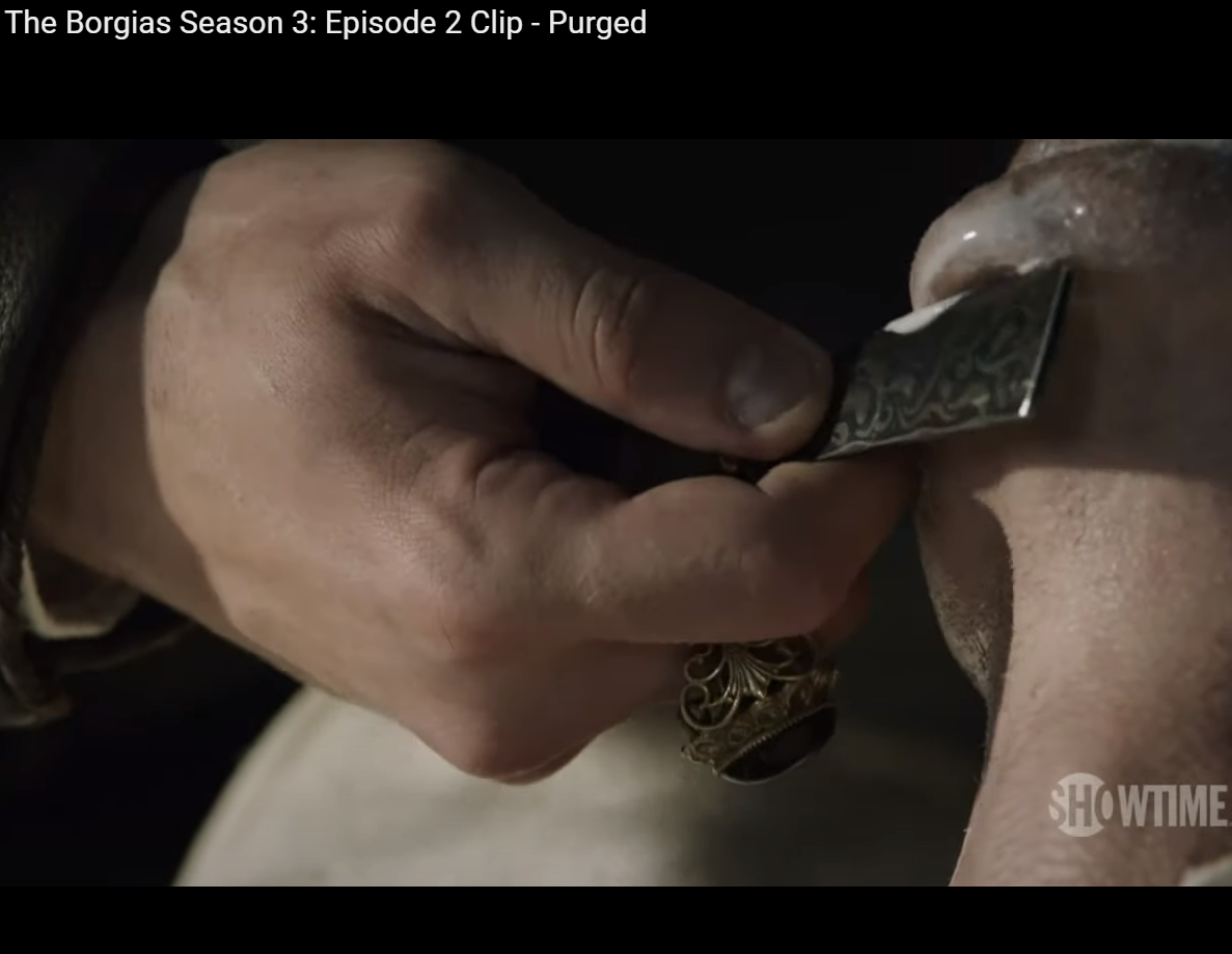 Канада, Венгрия, Ирландия Создатель Нил Джордан В ролях: Джереми Айронс, Франсуа Арно, Холлидей Грейнджер и др. Нил Джордан 10 лет готовился к создания этого сериала и его любов к аутентичности декоров, костюмов и причесок, дает мне основание предположить, что в этой сцене показана копия аутентичной бритвы конца ХIV - начала XV века. О самой сцене: Парикмахер начинаеть брить и порезал, а Чезаре Борджиа добриваеть своего отца - папа Александр VI ( Родриго Борджиа). Вот пожалуйста, отрывок из епизод 2, сезон 3: