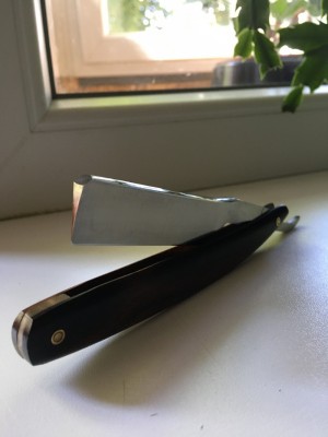 Мечтаю изготовить бритвуну совсем страшной Аптекарь мог побрезговать бриться, потому пришлось немного подмарафетить, но, скажем так, продавать такое я бы не стал, ну или за совсем дешево. Если не ошибаюсь это одна из двух брит из одного куска углеродки - одна была 1 к 4 обух-ширина и твердости за 60 далеко, а вторая с большим углом, но твердости 59 по моему было. Та которая мягче бреет не хуже, а может и лучше, но точится и правиться приятнее. Так что если обух миллиметров 6 и ширина около 20 , то у вас нестандартно мягкая бритва, потому и на старых англичан похожая, за 60 твердости позже калить стали Если у человека нет чувства юмора , у него должно быть чувство что у него нет чувства юмора (с)