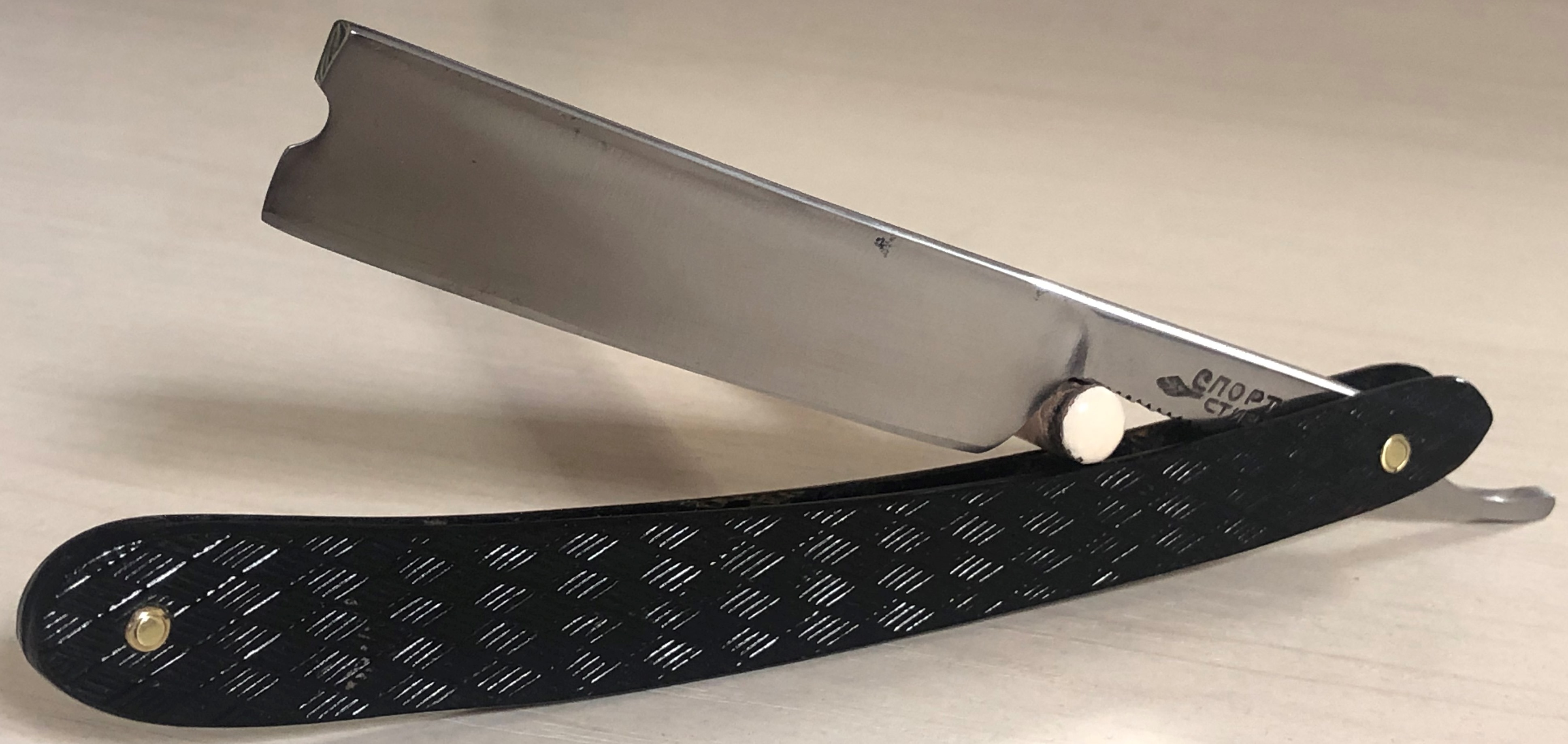 Бритва в очень хорошем состоянии для своих лет. Разобрал, немного освежил металл и снова собрал.Следов активного пользования и уточки клинка не замечено. Родную оправу не стал менять из за небольшой трещинки, которую намертво проклеил и зашлифовал.Кромочка равномерна по всей длине. Сталь чистая от разного рода видимых дефектов. Очень удобная и приятная бритва, во всех отношениях. Будет идеальным вариантом для новичка и просто в коллекцию, так как думаю что бритва достаточно редкая. Никогда ничего подобного не видел.Заточена и готова к бритью.