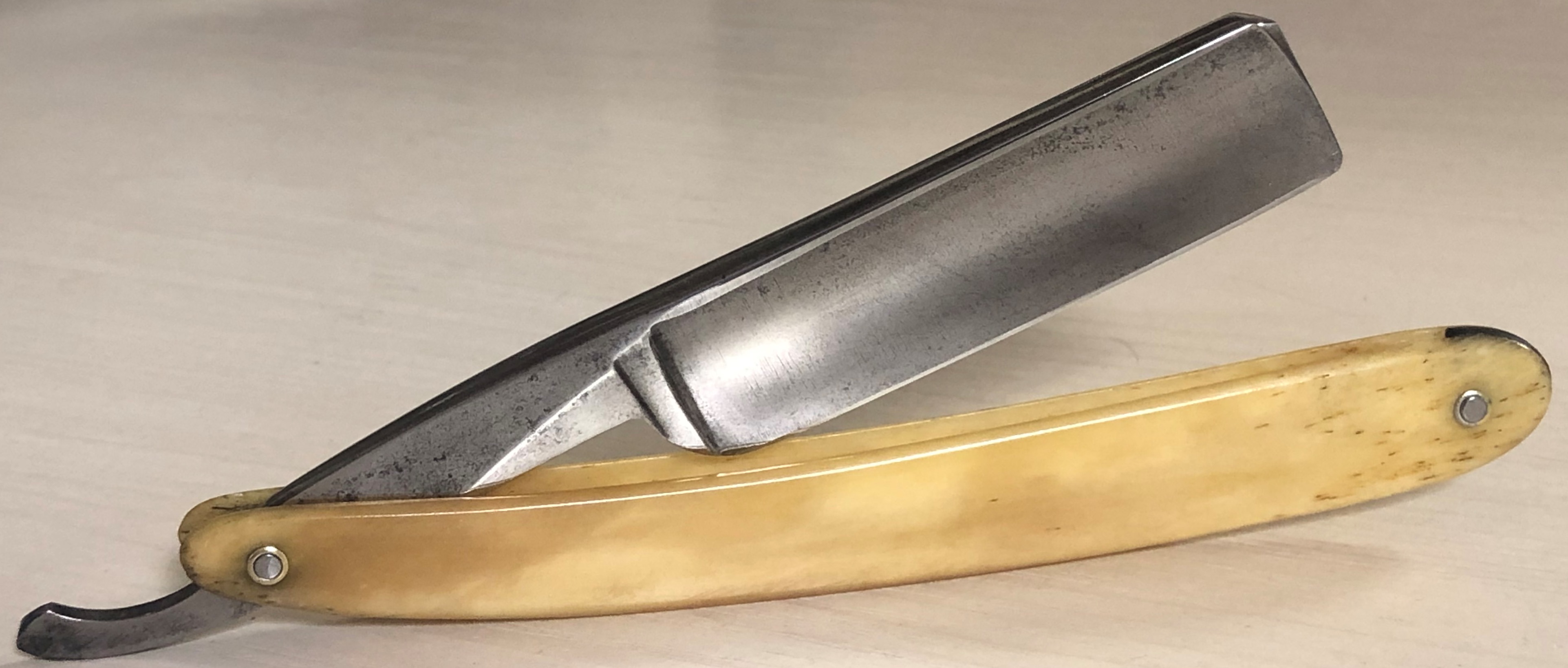 Бритва в прекрасном состоянии для своих лет, с благородным налётом патины по всему клинку, что встречается довольно редко. Естественно, удалять такой "налёт старины" у меня рука не поднимется убирать.Только небольшая чистка металла,для придания полотну равномерной патины.Бритва имеет незначительные и еле уловимые следы использования, а также"родную" шлифовку и ширину клинка, что для такого почтенного возраста является большой удачей.Грани не зализаны, а сама гравировка на полотне чёткая, без затёртостей..При разборке поменял старые пины на новые, с добавлением внутренних шайб.Идеальная геометрия полотна:кромочка равномерна по всей длине.Ручка из натуральной кости также в состоянии близком к идеальному., без трещин, отгрызанных мест или других дефектов.Мощная, красивая и тяжёлая оправа.Бритва имеет оригинальный и естественный вид, для своего возраста,без каких либо серьёзных вмешательств и может занять одно из почётных мест в любой коллекции бритвомана.Заточена, лично протестирована и полностью готова к бою.