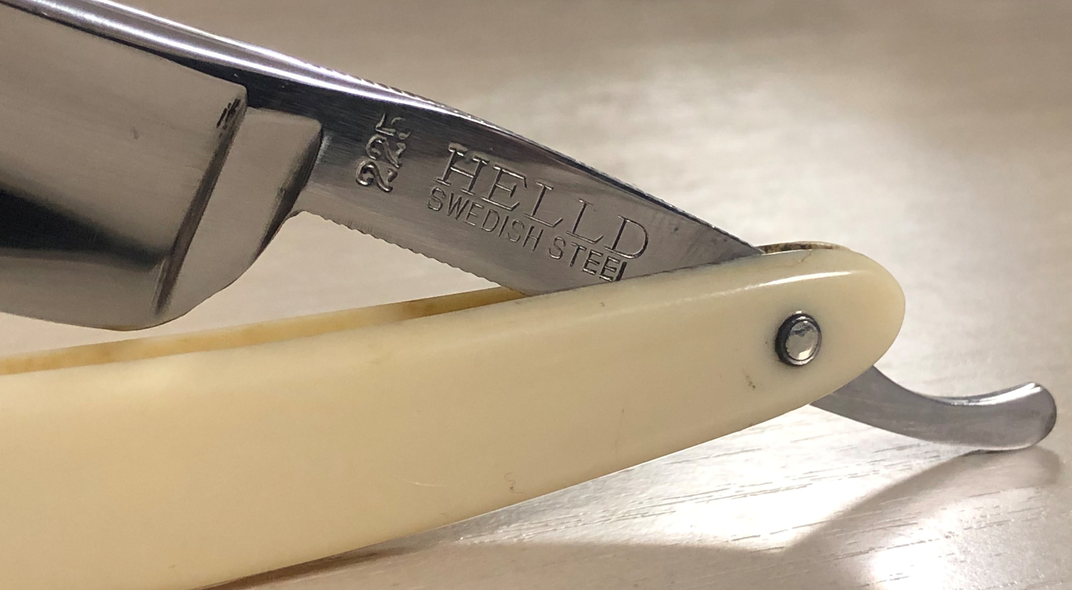 Бритва в очень хорошем состоянии для своих лет. Разобрал, немного освежил металл и снова собрал.Следов активного пользования и уточки клинка не замечено. Родную оправу не стал менять из за небольшой трещинки, которую намертво проклеил и зашлифовал.Кромочка равномерна по всей длине. Сталь чистая от разного рода видимых дефектов. Очень удобная и приятная бритва, во всех отношениях. Будет идеальным вариантом для новичка и просто в коллекцию, так как думаю что бритва достаточно редкая. Никогда ничего подобного не видел.Заточена и готова к бритью.
