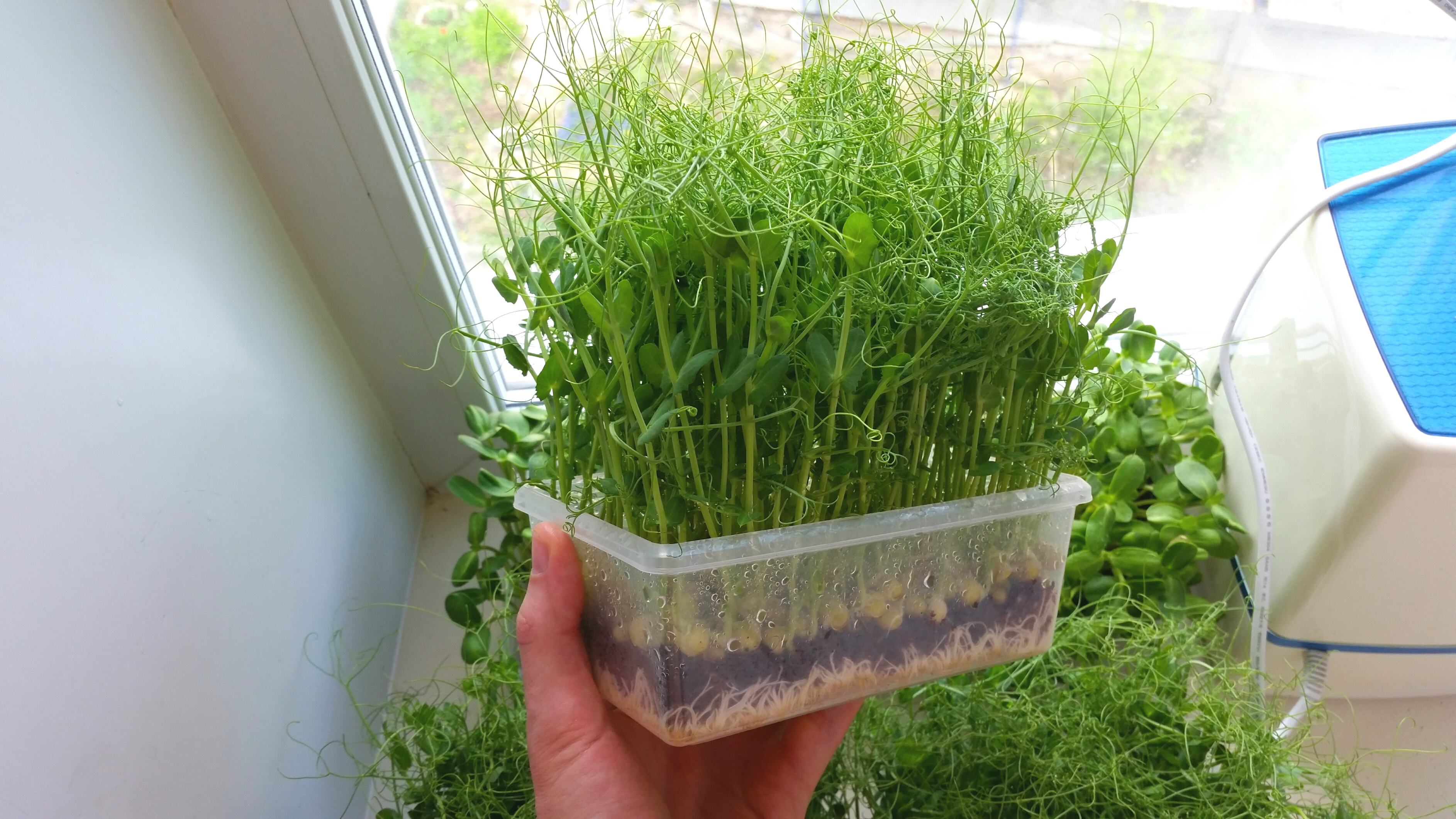 Наше прочее хоббиГрядка на подоконнике, пока растет немного: горошек, подсолнечник, горчица, редис, рукола