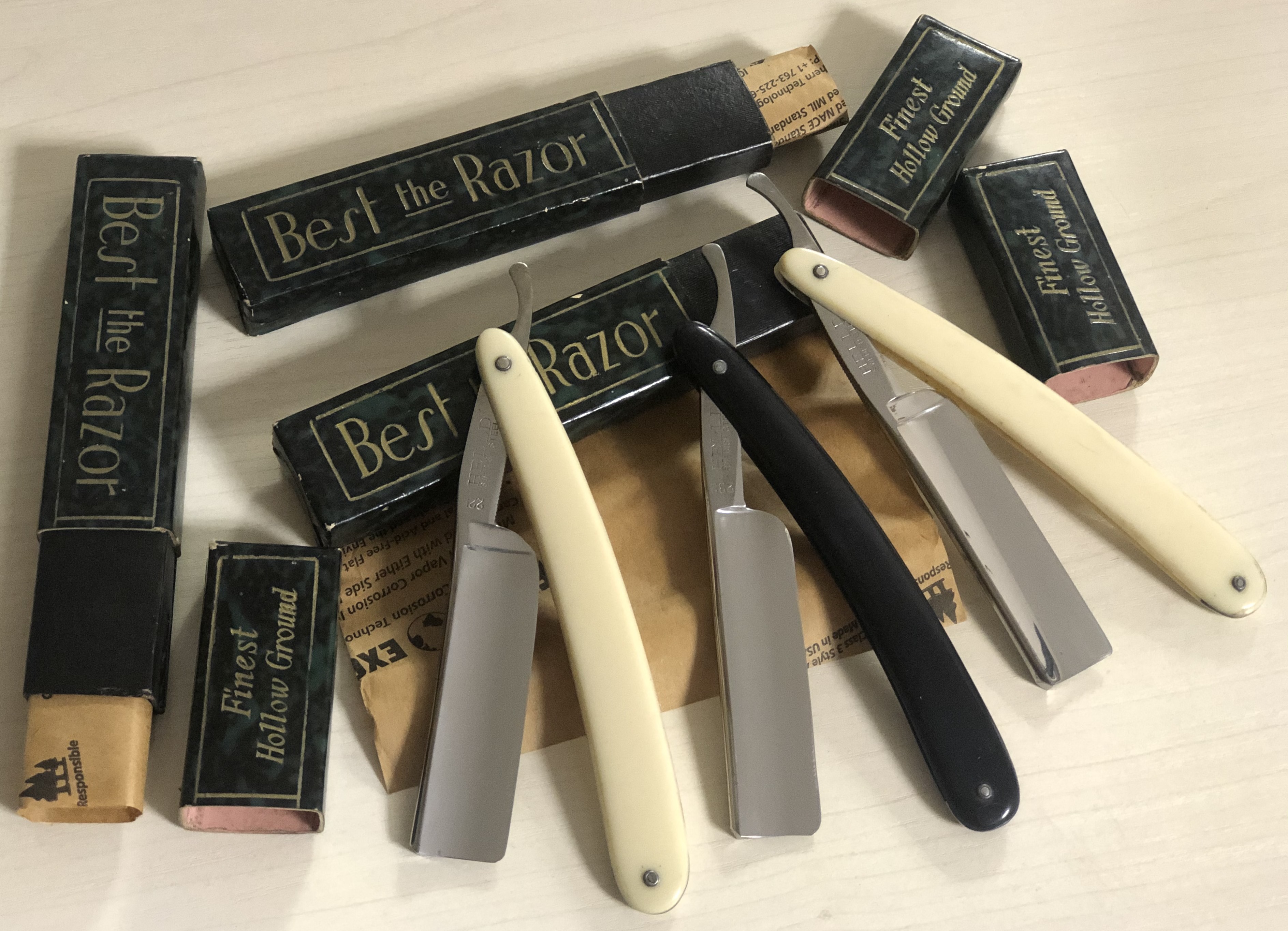 Бритвы ординарные, по всей видимости середины 20-го столетия.По производителю ничего не нашёл, но бритвы из старых запасов, старые.