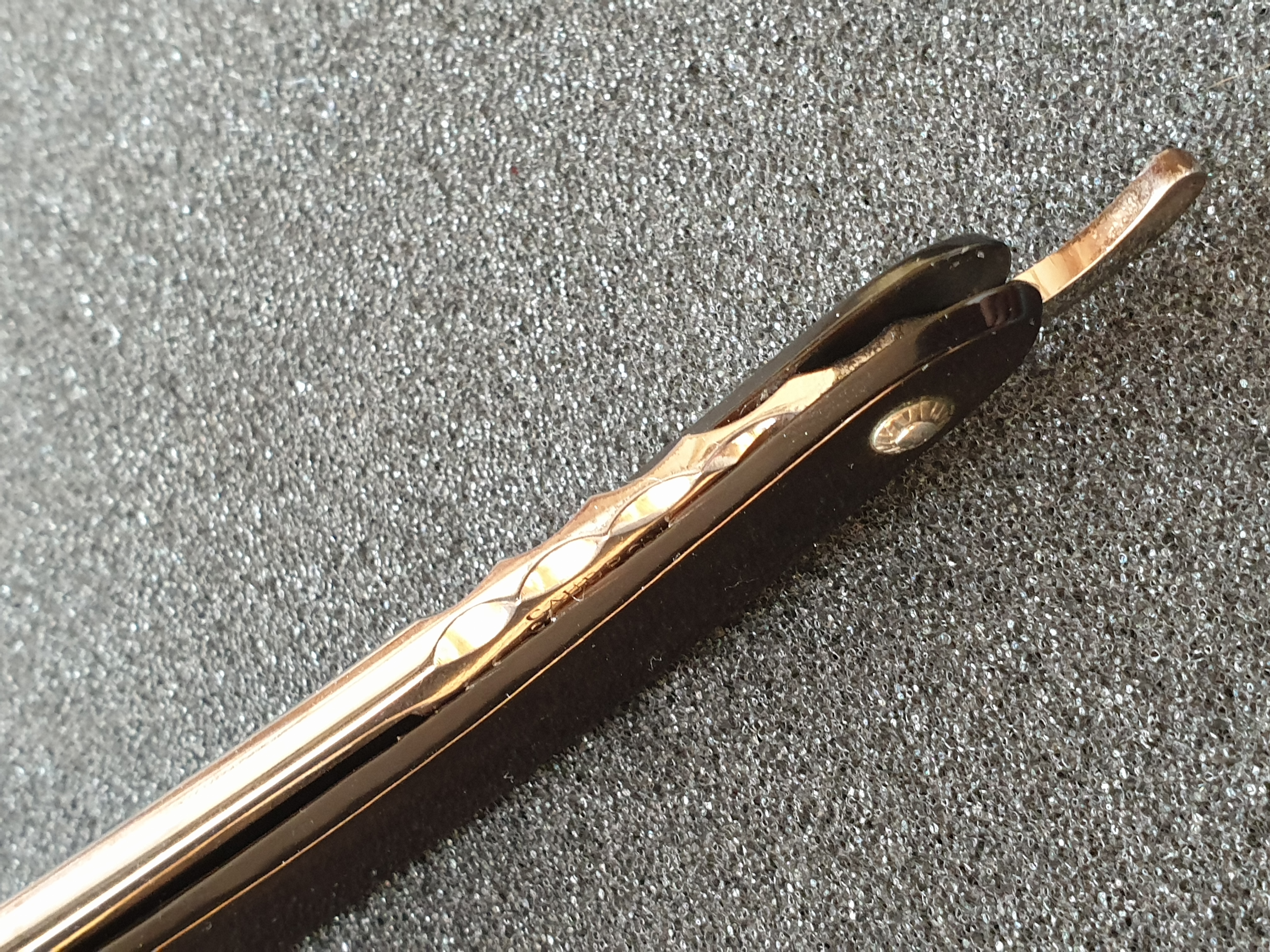 Продаётся от S&T68. Французский винтажный фреймбэк, требует некоторых работ для приведения в порядок. Ширина клинка 20мм, ручка из целлулоида, пины латунные. Все родное, бритва не разбиралась. На кромке был скольчик, он убран, но полноценная заточка не делалась. Клинок паркуется в ручку без закусываний, но с легким "закосом", на ручке грубоватая "персонализация" владельца.