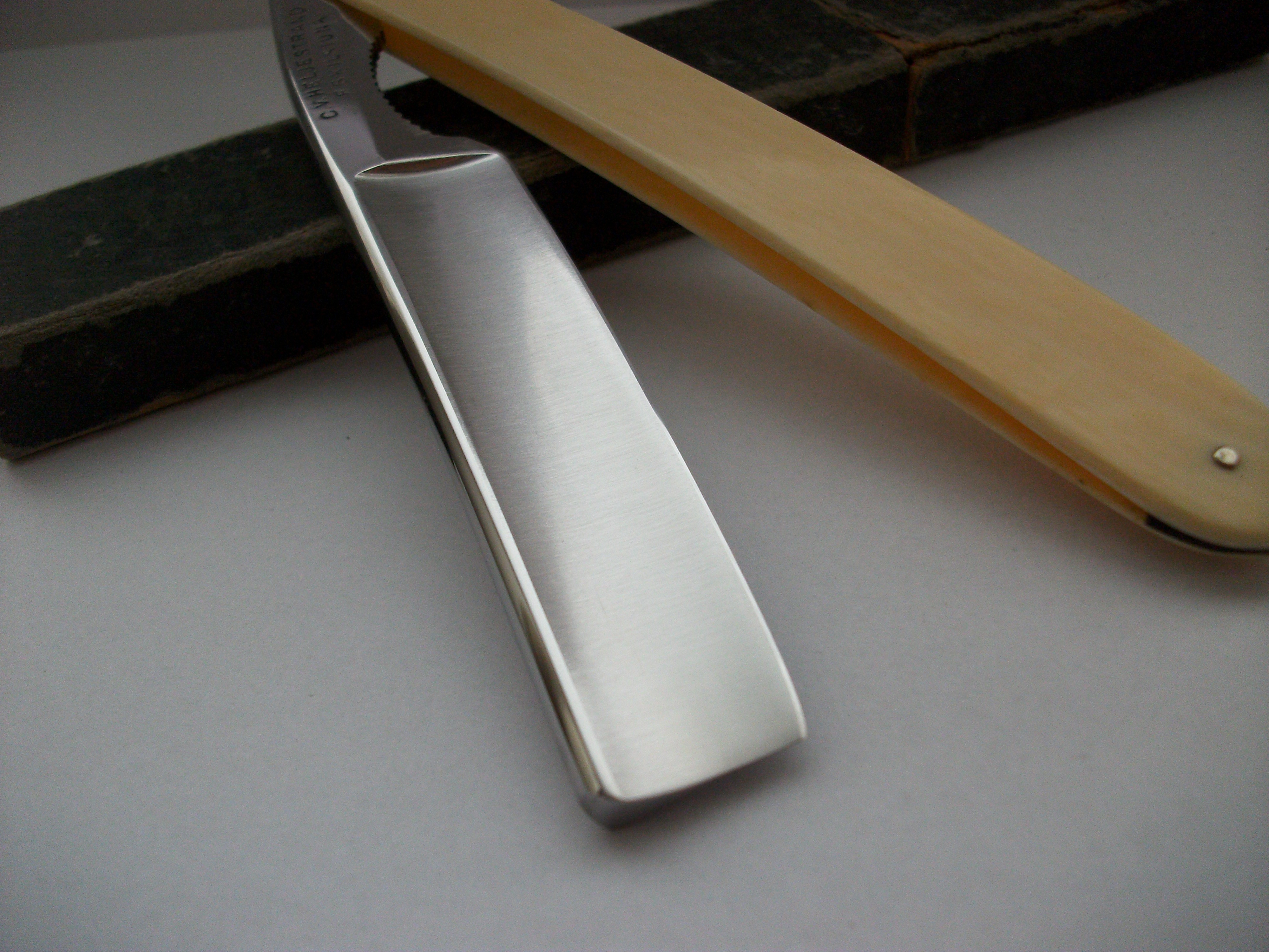 Углеродистая сталь, ширина полотна 20мм, длина режущей кромки 70мм, ручка - слоновая кость, клинышек - олово. Заточена и готова к бритью 17 000 руб. Доставка включена в стоимость.