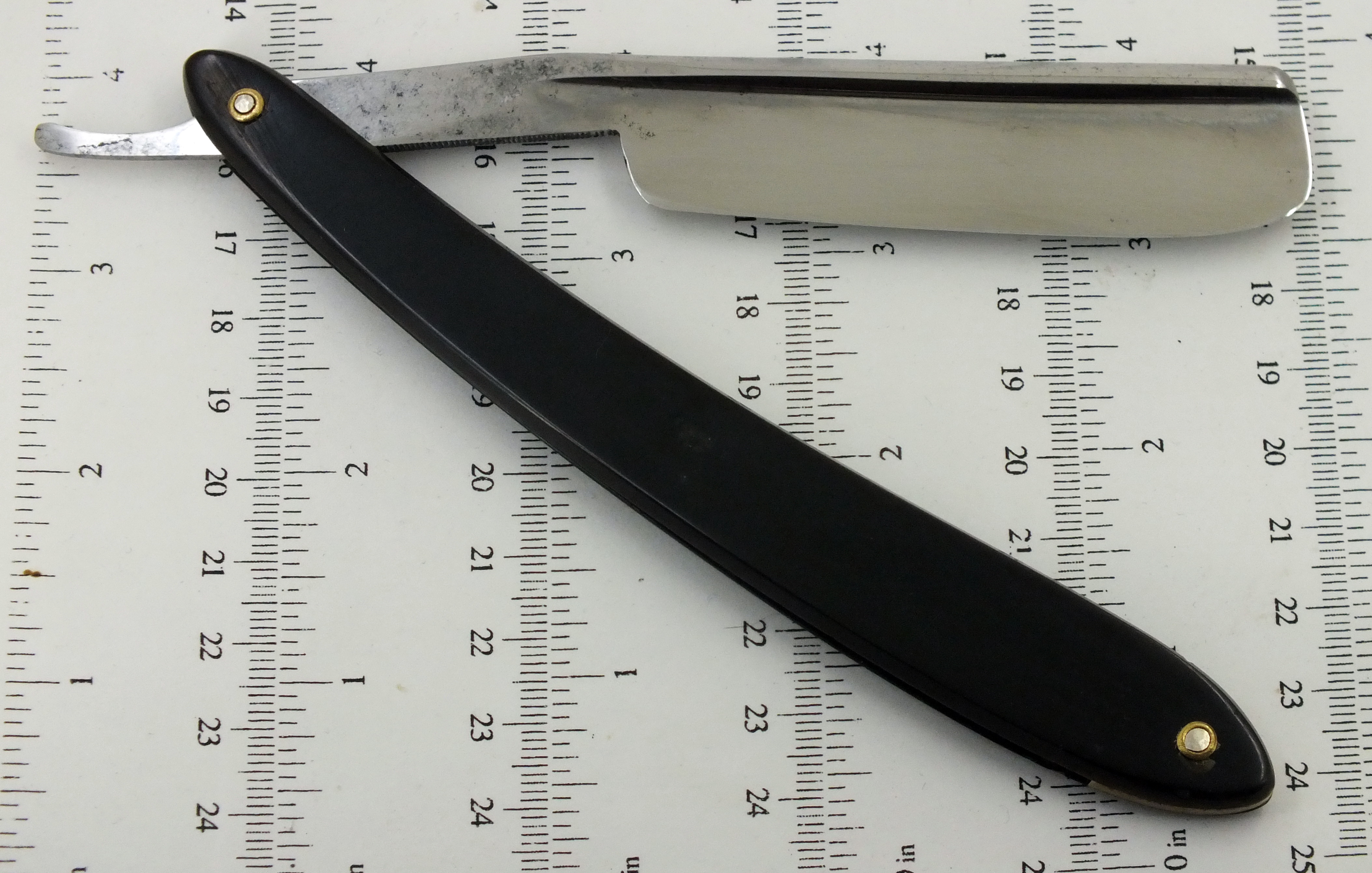 15/16 (24мм) Углеродистая сталь, рог, кость. Бритва после реставрации. На клинке остались следы времени в виде участков точечной патины. Оправа новая. Бритва заточена и готова к бритью. На моё субъективное мнение бреет превосходно, как все старые англичане и французы из допотопной [добессемеровской, домартеновской] стали. Продано Spoiler Show Spoiler Show