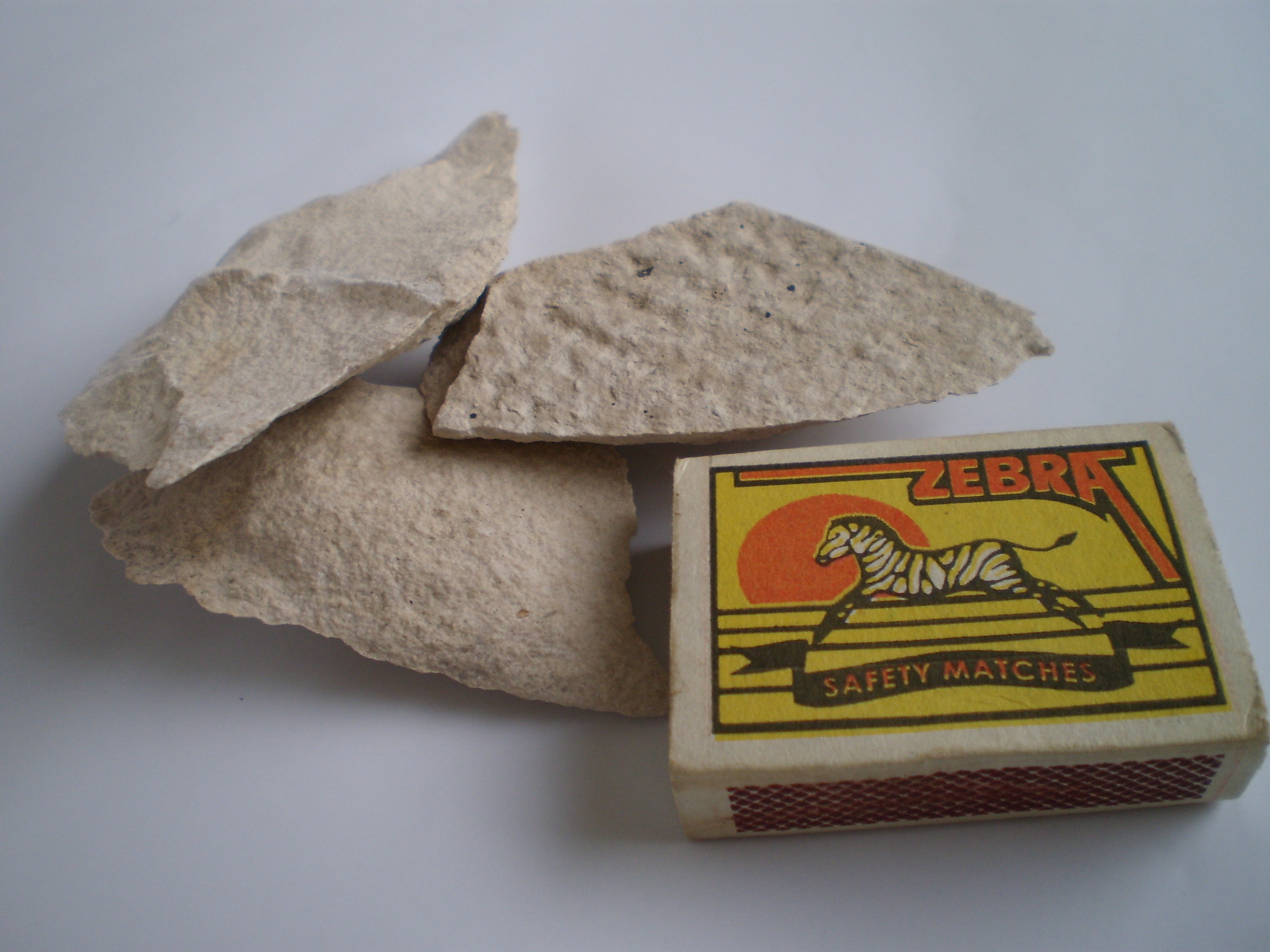 А вот кусочки из остатков второго камня, они чешуйчатой формы с острыми углами. На одном из них видны следы промышленной обработки: