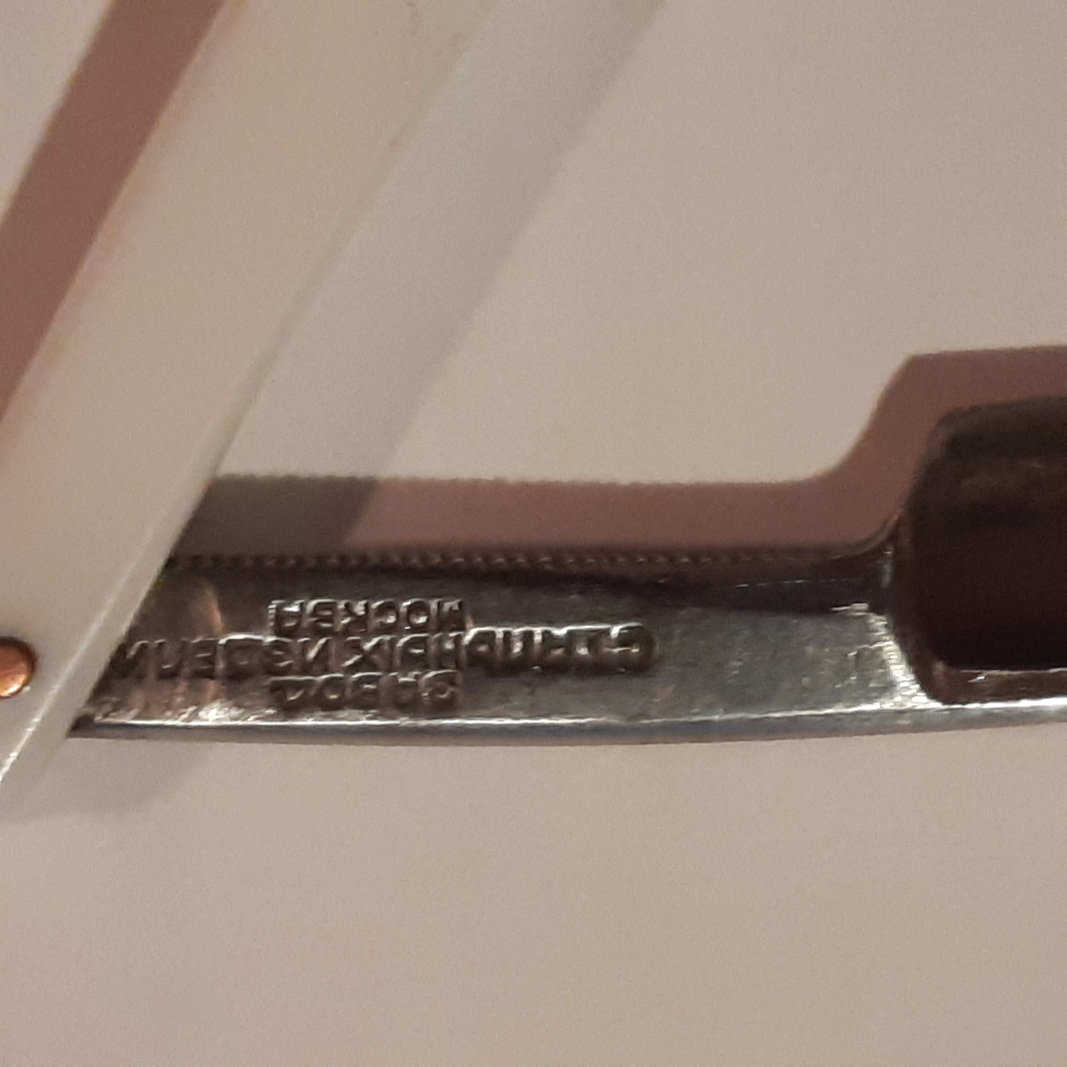 На моей над режущей кромкой ниже изображения ракеты видна проточка на клинке.Предполагаю,что это и был заводской косяк,который на заводе же и исправили.