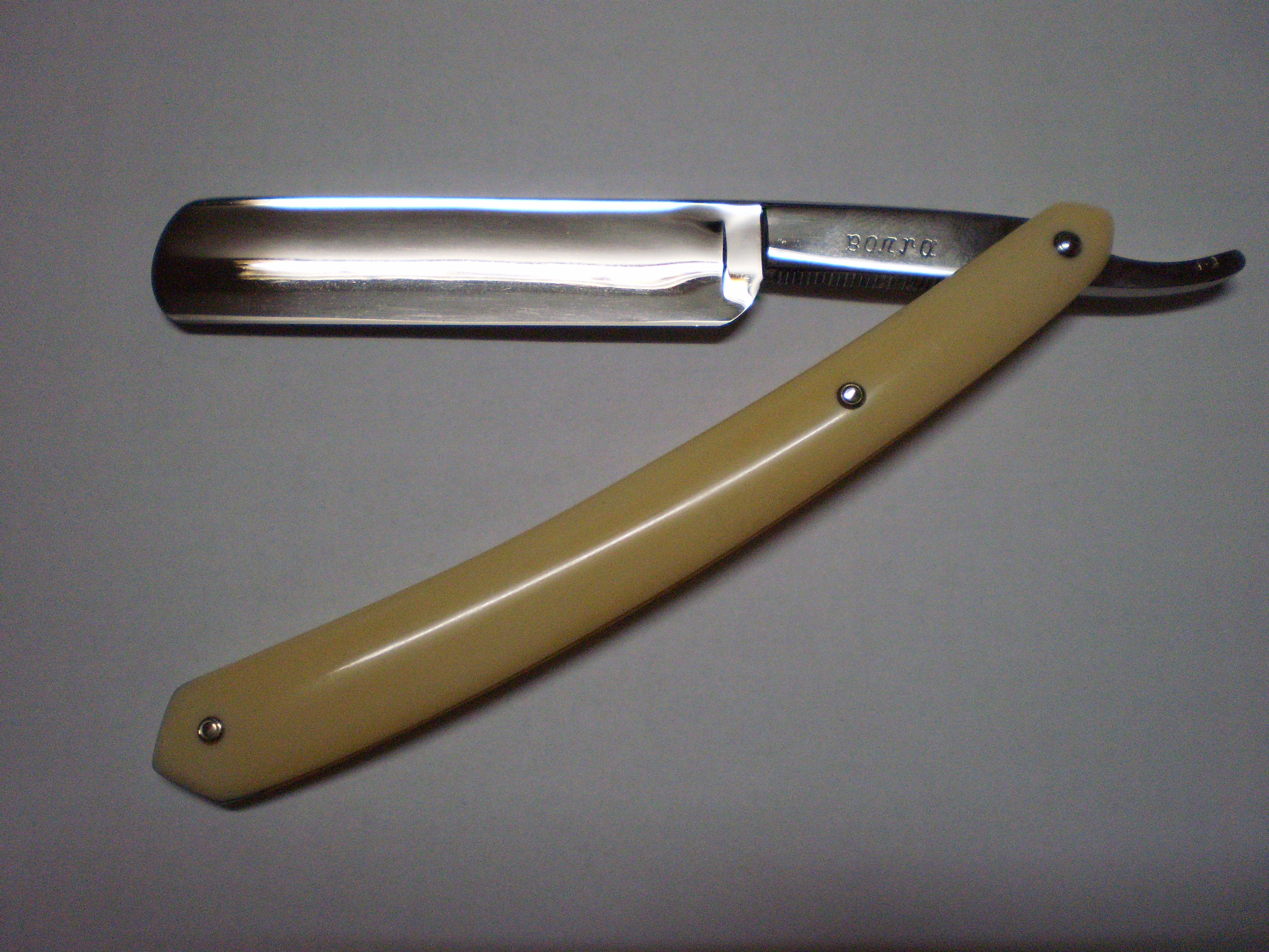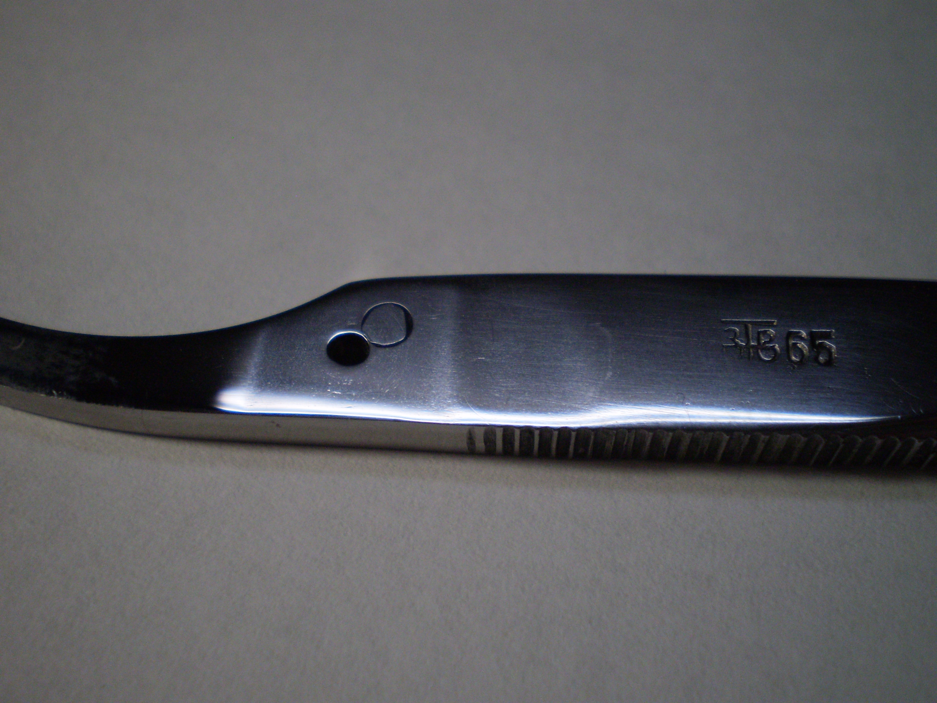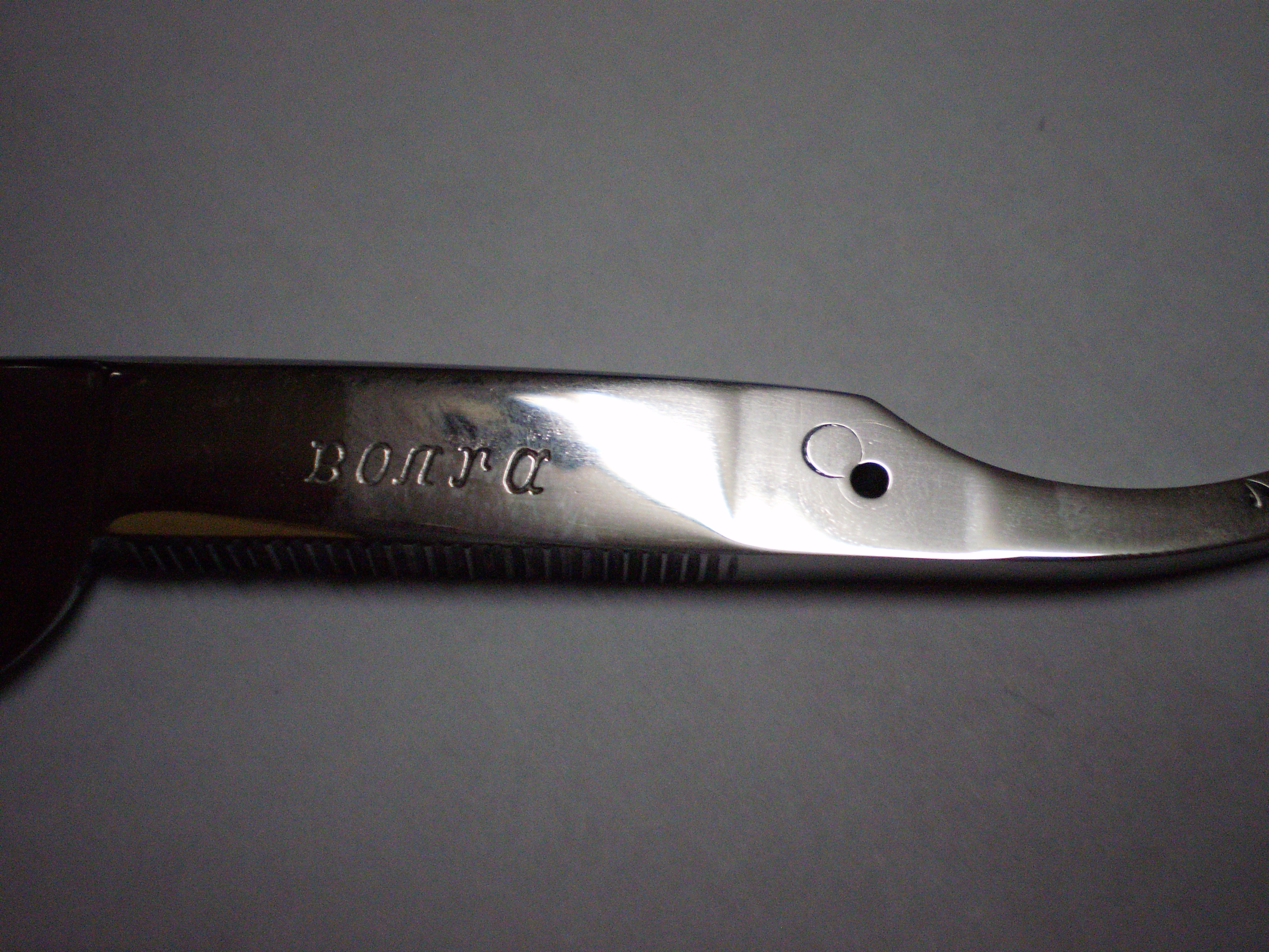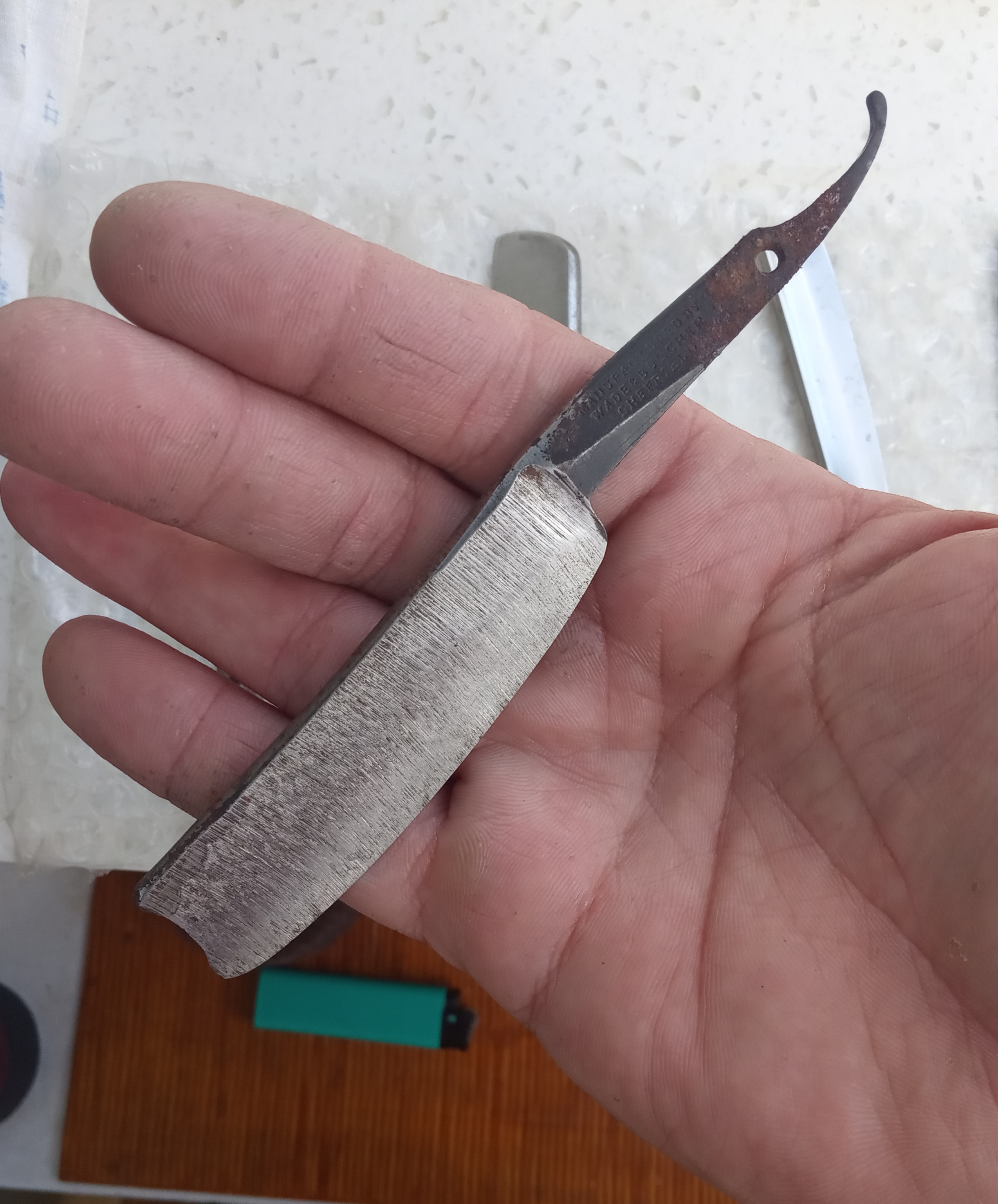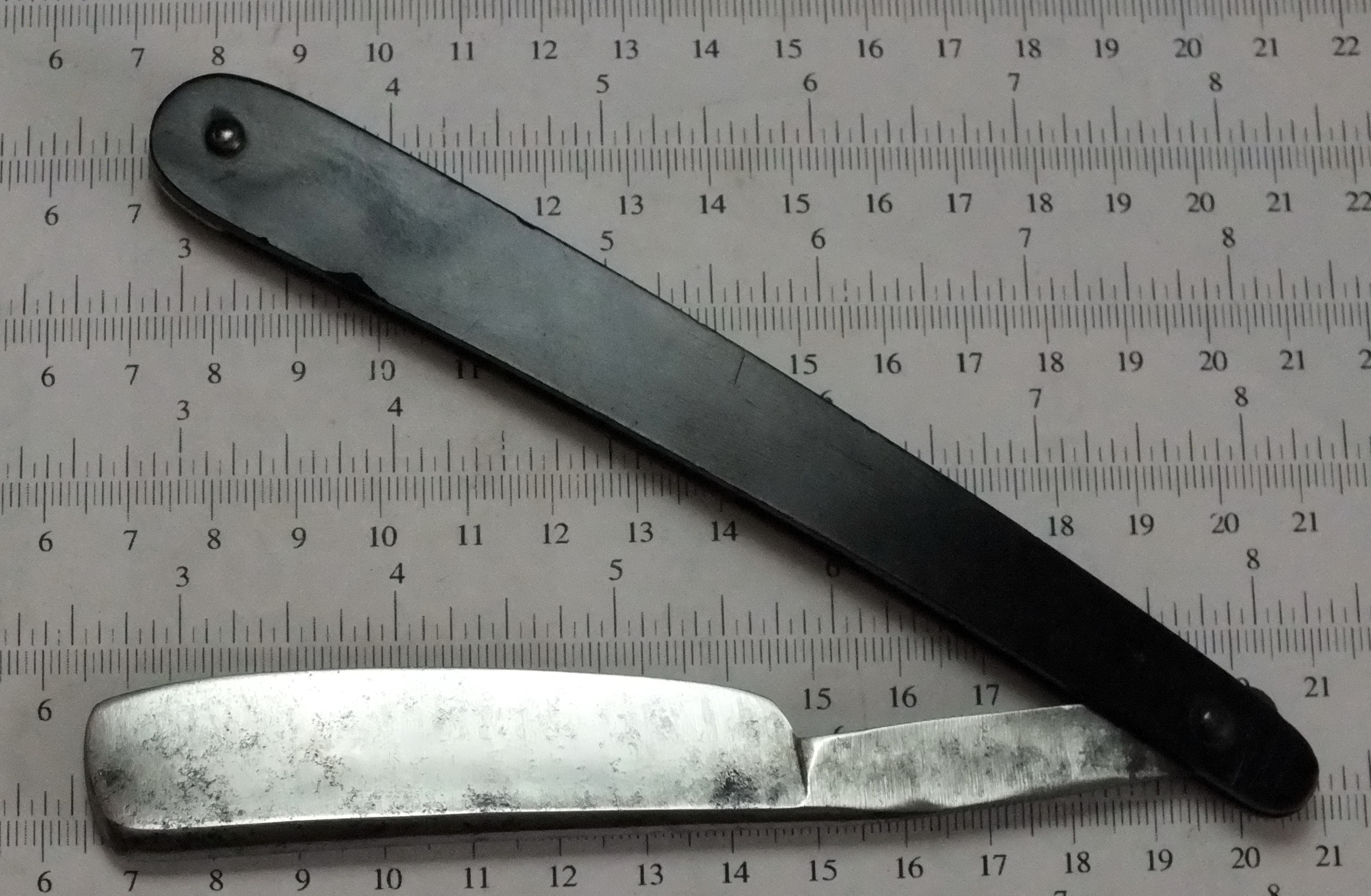 В такой ситуации нельзя поставить заклепку, просто ручка потрескается, потому что под ней нет твердой опоры. Чтобы получить ровную поверхность, пришлось бы стереть всех надписей, но я этого не хотел, поэтому шлифовал металл толко на узких участках ерла – шириной чуть больше 10 мм. На этих участках поставлю внутренних шайб из нержавеющей стали толщиной в 0,45 мм. Так как после очистки от ржавчиный диаметр осевого отверстия увеличился на 2,6 мм, впритык просверлил новое отверстие диаметром 1,8 мм для осевой заклепки. В старом отверстии поставил кусочек ненужного винтика и приклеил епоксидкой. Вот как выглядит ерл после такой обработки: Узкие участки ерла шлифуются при помощи куска стали (размер 10х10х100мм), на котором приклеивается наждачная бумага. И начал шлифовать, ех раз, да еще раз, да еще много-много раз ... В общем, участки „утонули” на около 0,20 мм ниже поверхности ерла. После заклепывания, зазор между ерлом и ручки сохранился. На фото это хорошо видно: В дальнейшем поставил ручку от „погибшей” немки и Волга обрела вторую счастливую жизнь. Я таких вещей (шлифование узких участках ерла) проделывал несколько раз и всегда с отличным результатом. Вот бритва после вышеописанной операции: С 2013 г. с кайфом бреюсь опасной бритвой пять раз в неделю, в три прохода.