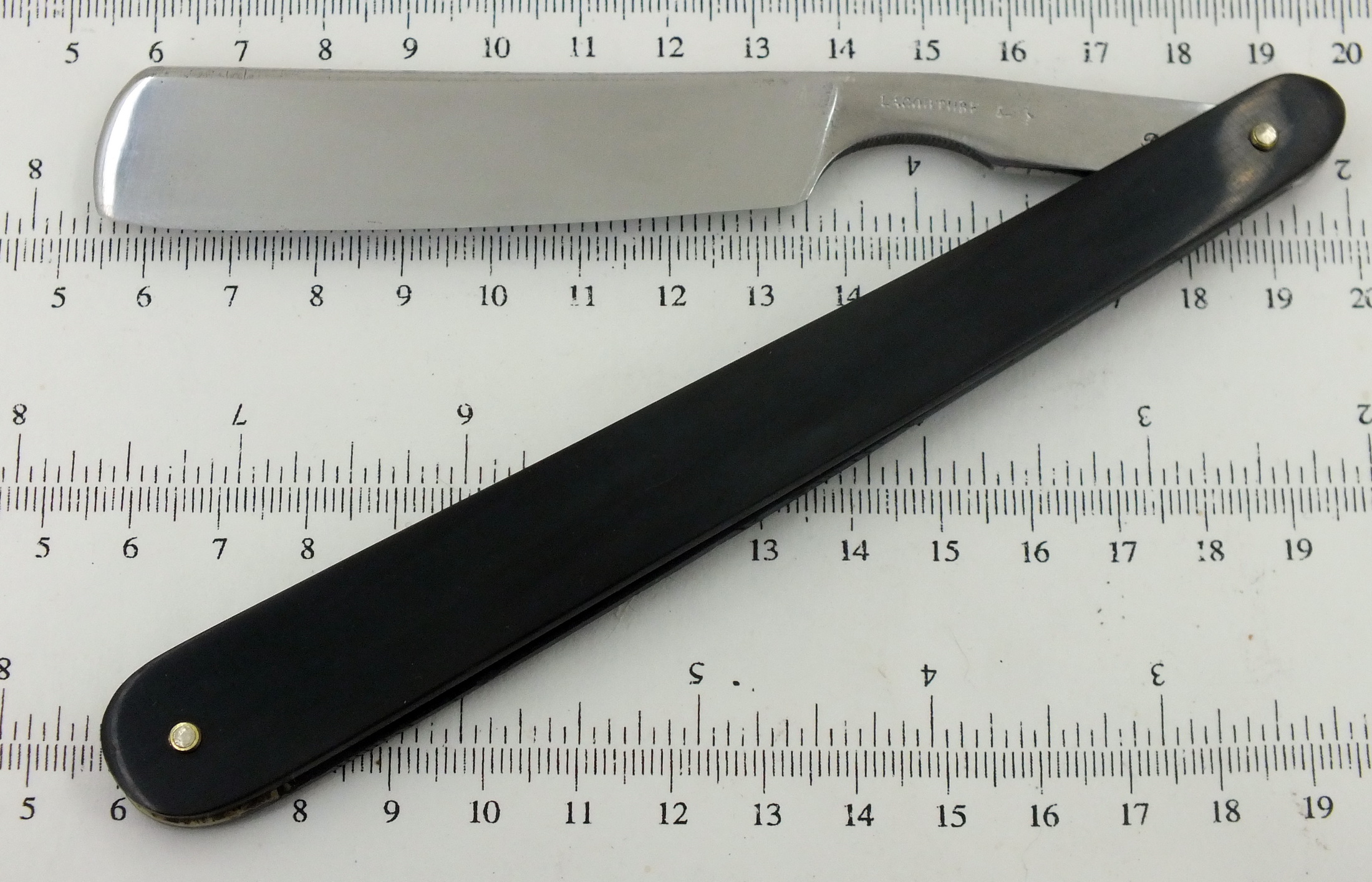 15/16 (24мм) Углеродистая сталь, рог, кость. Бритва после реставрации. На клинке остались следы времени в виде участков точечной патины. Оправа новая. Бритва заточена и готова к бритью. На моё субъективное мнение бреет превосходно, как все старые англичане и французы из допотопной [добессемеровской, домартеновской] стали. Продано Spoiler Show Spoiler Show