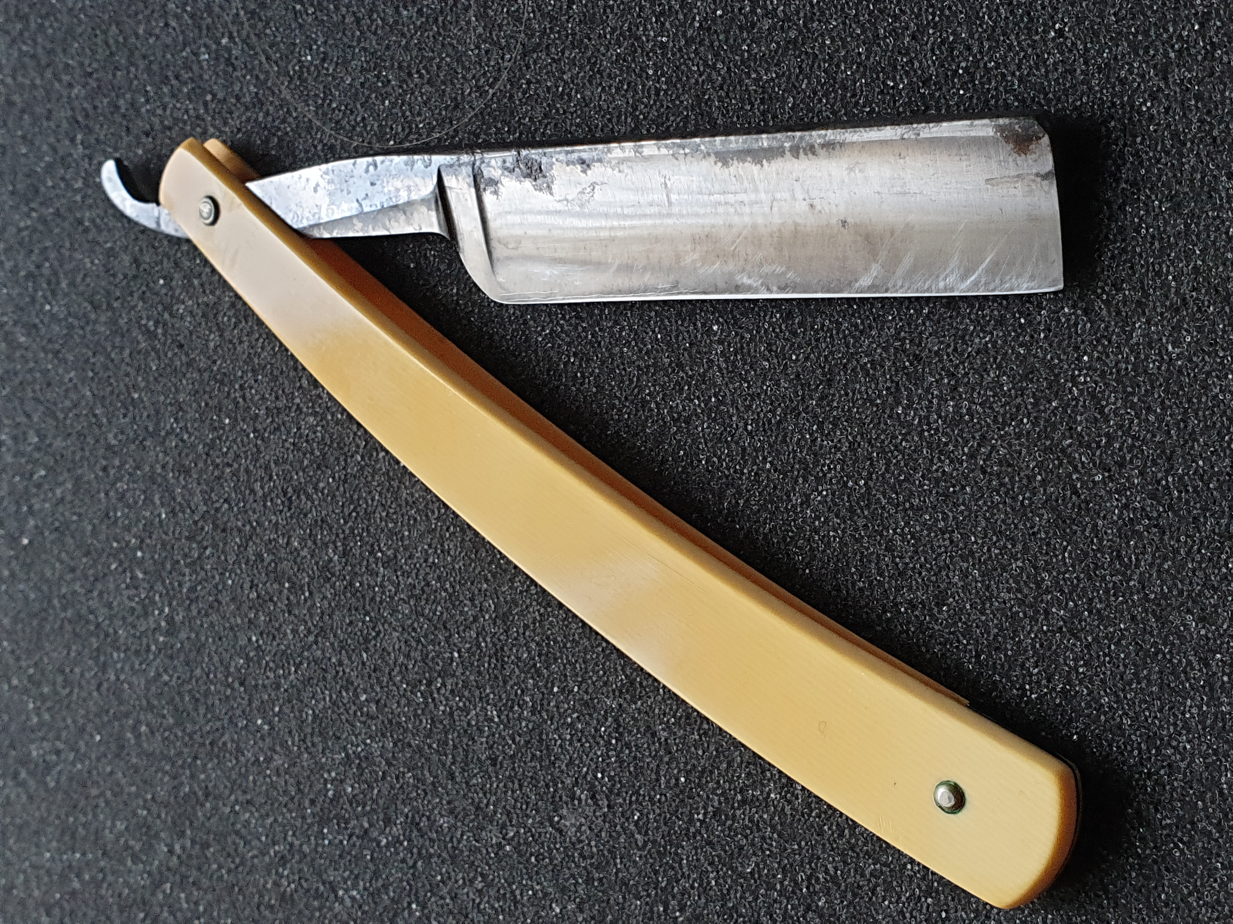 Продаётся от S&T83. Американка Clauss (Fremont Ohio) из предположительно 1920-1930-х годов, под ремонт (укорочение клинка) и легкое восстановление. Трещина клинка на расстоянии 9мм от кончика носа при длине РК 70мм. Ширина клинка 20+мм. Ручка из бакелита, ровная, без трещин, есть пара процарапанных "персонализаций" владельца. Клинок почти совсем без коррозии и вероятно только на заводе был заточен, обух 5,5+мм. Пины родные, бритва не разбиралась, насечка на эрле чистая. Клинок паркуется в ручку ровно, без перекосов и закусываний. Продается "как есть".