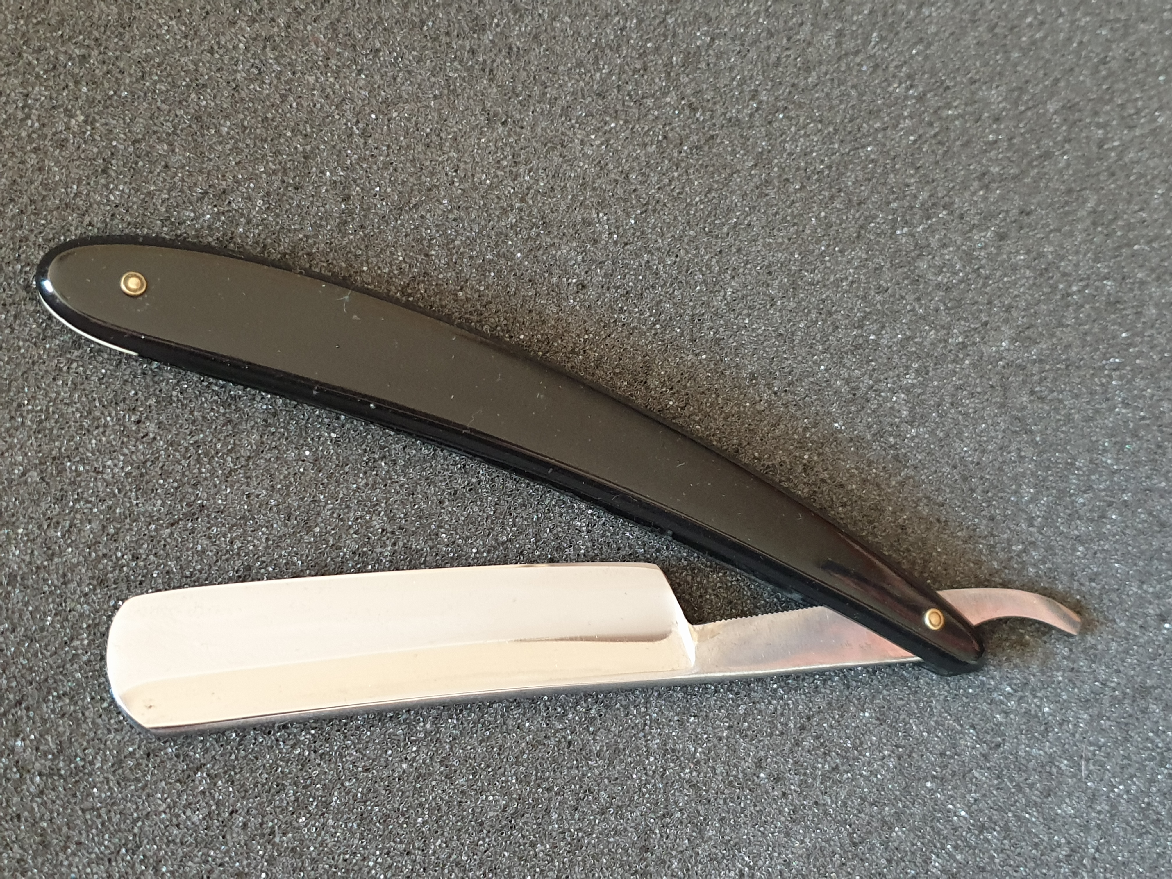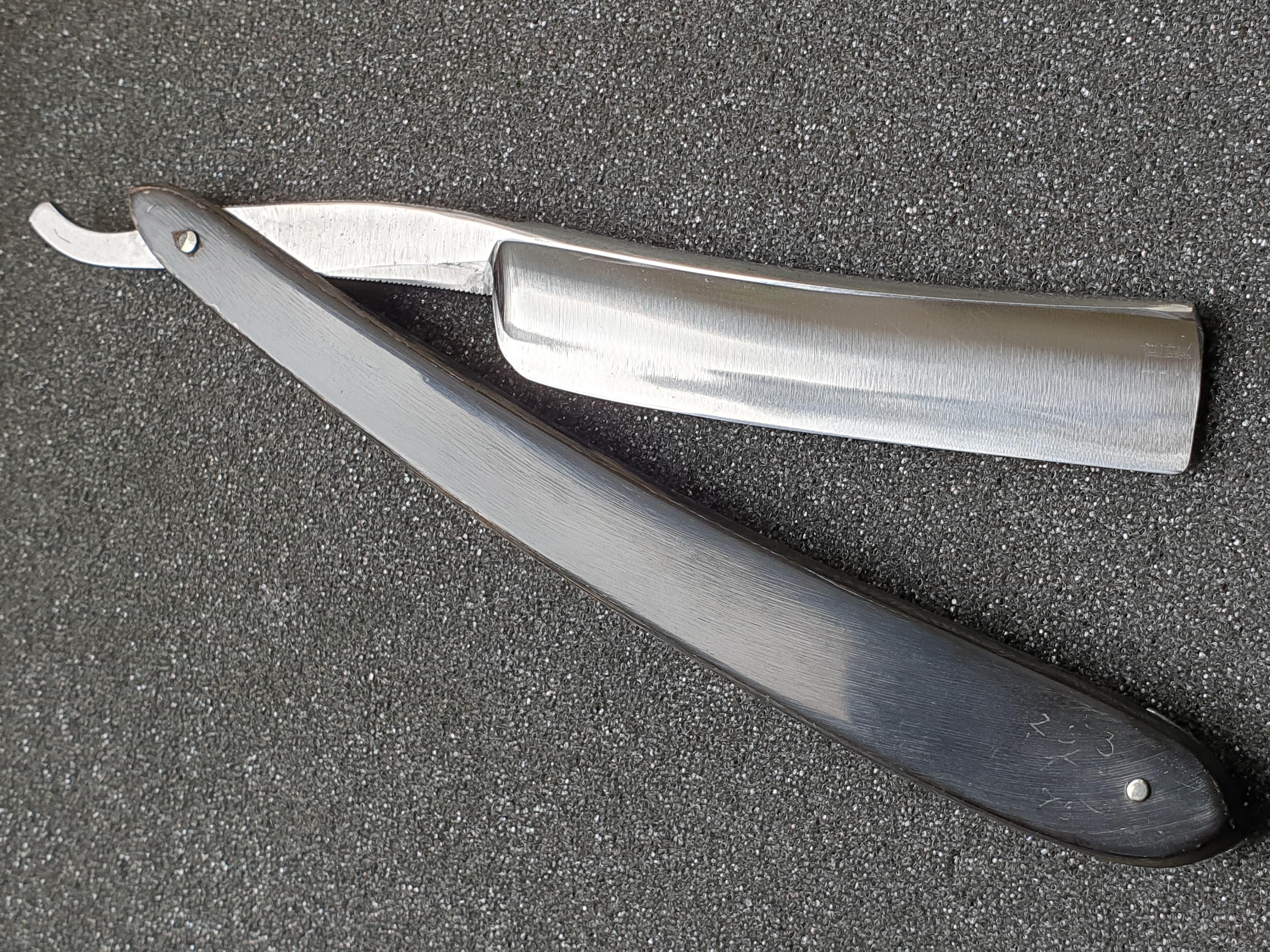 Продаётся от S&T85. Joseph Rodgers&sons, Шеффилд, поставщик королевского двора, XIX век. Ширина клинка 18мм, ручка - рог, клинышек - олово. Все родное, бритва не разбиралась и не восстанавливалась, оригинальный гринд клинка. Сделана свежая заточка на японских камнях, финиш на Озуку. Ручка не идеально ровная, но парковке клинка не мешает.