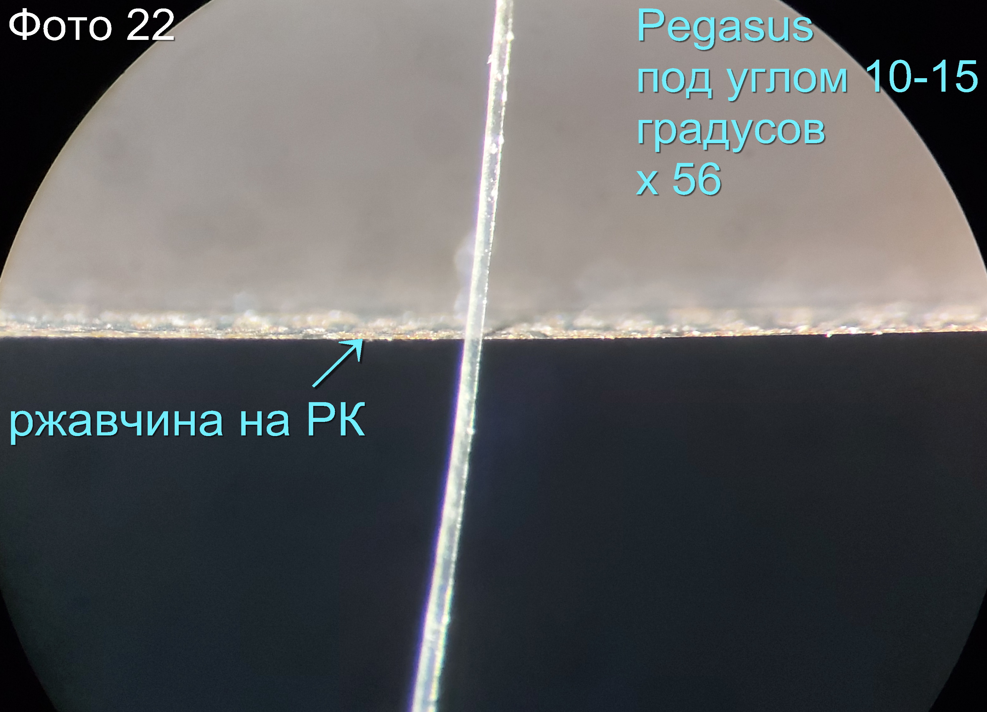 Я рассмотрю и покажу что произходит с РК, когда бритва начинает ржаветь. Вначале я хочу объяснить, что применяемый по отношению к РК термин радиус скругления не является специфичным ножевым термином, как, наверное, думают некоторые. Этот термин происходит от диаметр окружности, вписанной в профиль острия. Об этом писал А. Б. Герчиков в „КАК БРИТВА”. Я процитирую его слова: „Показателем остроты принято считать диаметр окружности, вписанной в профиль острия”: viewtopic.php?p=1319#p1319 И так, более полутора месяца я хранил в жилую комнату несколько заточенных бритв (рабочие лошадки), в пластиковой коробке с приоткрытой крышкой. Бритвы не обрабатывал маслом или другим средством для защиты от ржавчины. И вдруг меня дёрнуло, я рассмотрел их и обнаружил на одной из них (Pegasus), на переднем крае полотна малозаметное пятно. Оно как легкая туманность и его трудно сфотографировать. Конечно, мне хотелось думать, что пострадало только полотно, а РК осталась нетронутой и решил посмотреть под микроскопом. Свет идет спереди и под углом около 45 градусов к горизонтали. Вот на Фото 21 и Фото 22 увидел ржавчину во всей красе: Все таки, я сохранил надежду и что бы убрать ржавчину и увидеть истинное состояние РК, решил править бритву на ремне. Но чтобы не запачкать своего хорошего ремня, я правил на хорошо отшлифованном брючном, которого я использовал для этой цели много лет назад. Вот Фото 23 под углом около 90 градусов, после правки. Оно очень информативное. Ржавчина ушла с фасок и РК и стало видно, что она „съела” целые куски с РК и там ямки! РК представляет собой не прямую, а волнообразную линию. Короче говоря на жаргоне, ппц РК! Так как пятно находится в передней части бритвы, ржавчины захватила и уничтожила всю первую половину РК. На Фото 24 под углом 10-15 градусов видно, что жалкие остатки РК имеют большой радиус скругления и поэтому отражают свет в виде широкой прерванной светлой полосы. То есть, РК сильно затупилась. А там где РК не блестит - там ржавчина „съела” куски с нее, в результате чего образовались ямки. Если учитывать, что кроме сильного затупления, ржавчина сделала ямки на РК, вывод совершенно ясен и однозначен – бритву придется затачивать сного. Такие вот дела. Самое интересное в том, что в данном конкретном случае, наблюдения показали, что не получилось так, чтобы полотно легко пострадало от ржавчины, а РК сохранилась без поражений. Все очень непросто. В прошлом я не раз наблюдал под микроскопом, что ржавые пятна с четкими краями от водных капель на полотне существували на бритвах с незатронутой РК. Так что, к счастью, не каждое ржавое пятно на бритве означает, что РК уничтожена. ИМХО самыми опасными являются мгливые, туманные пятна, которые указывают что ржавчина начинает распространяться равномерно во всех направлениях от первоначального очага. Надеюсь, было интересно. С 2013 г. с кайфом бреюсь опасной бритвой пять раз в неделю, в три прохода.
